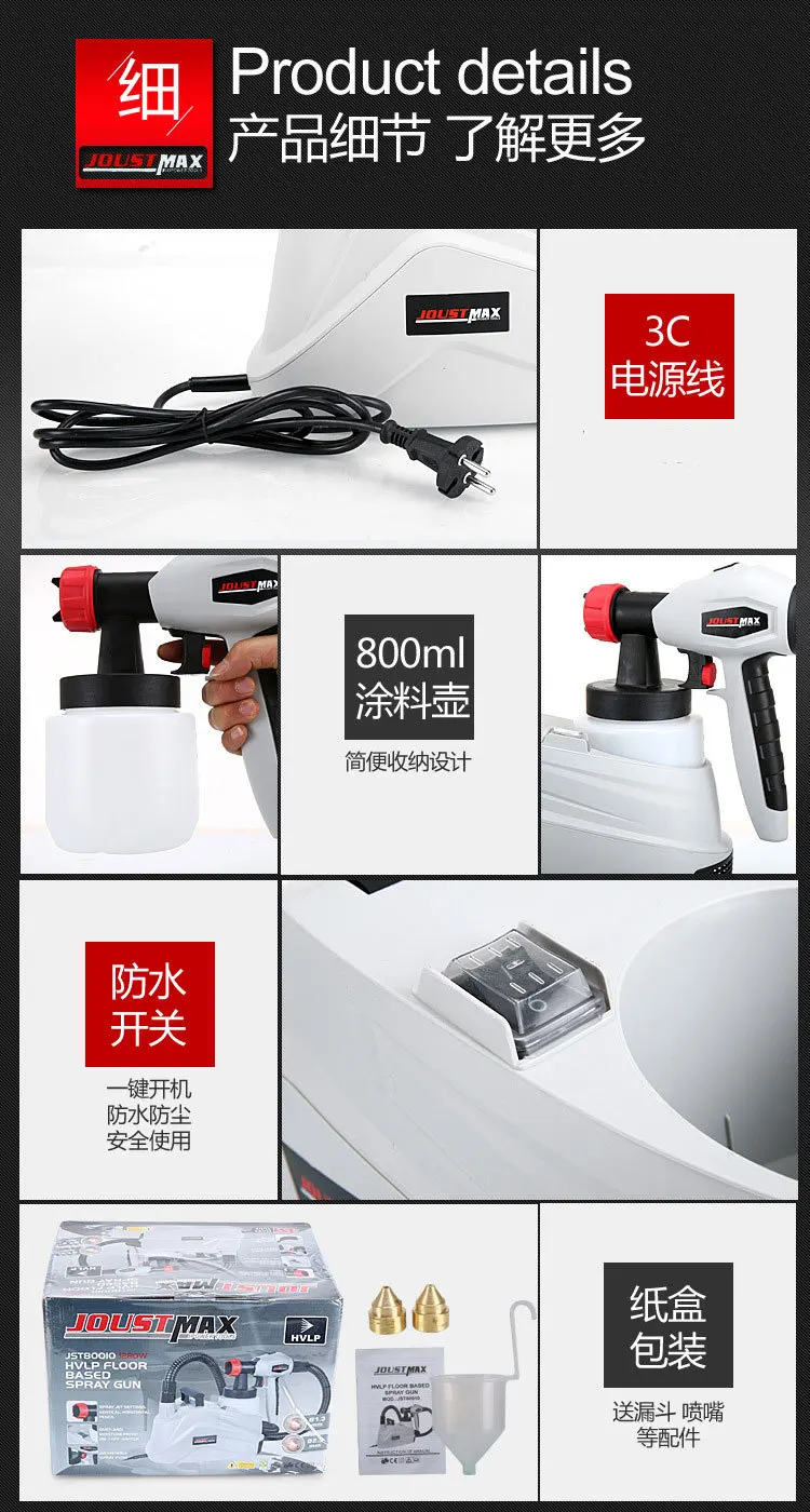 Название продукта: электрическая безвоздушная аэрозольная краска Модель продукта: JST80010 Частота напряжения: 220-240 В, 50 Гц Выходная мощность: 1280 Вт Скорость Распыления: 800 м/мин Емкость контейнера: 800 мл Вязкость распыления: 90din/сек Длина шнура питания: 2 м