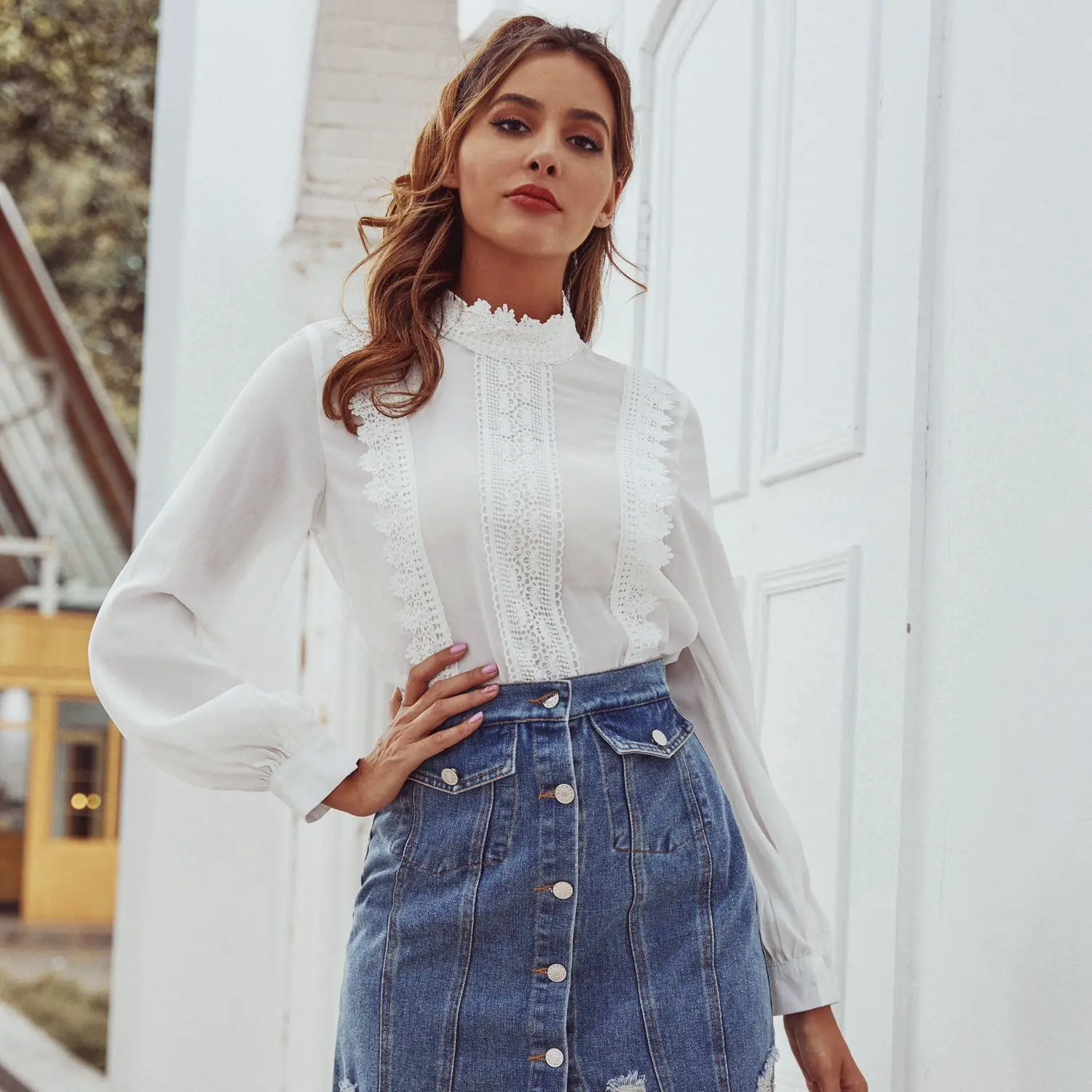 Купить Женская кружевная блузка элегантная белая прозрачная офисная рубашка с круглым