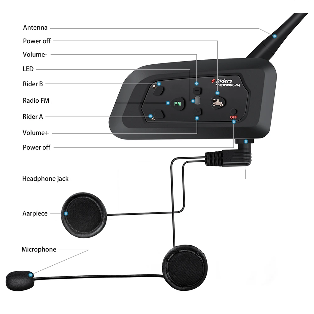 4 всадников:Поддержка 4 гонщиков полный дуплексный беспроводной разговор в то же время до 1200 м Диапазон разговора на открытой местности, Время разговора до 8 часов. Не нужно переключать.