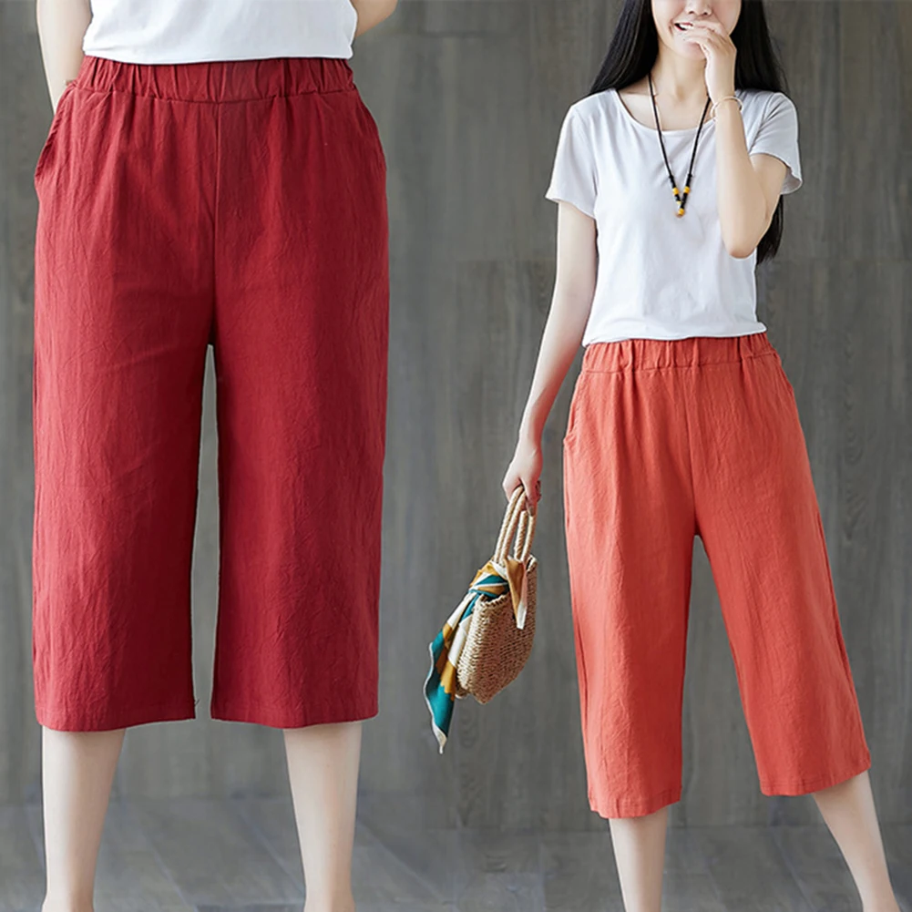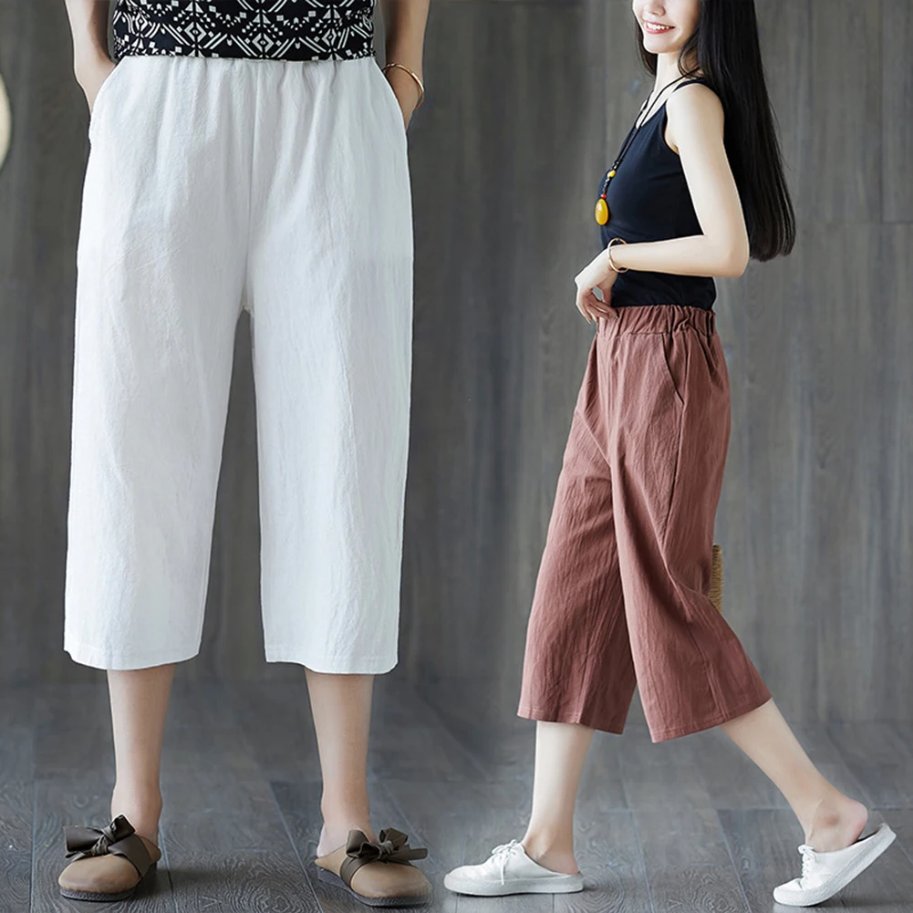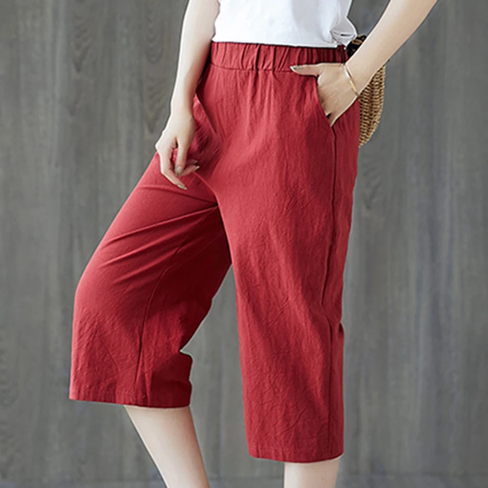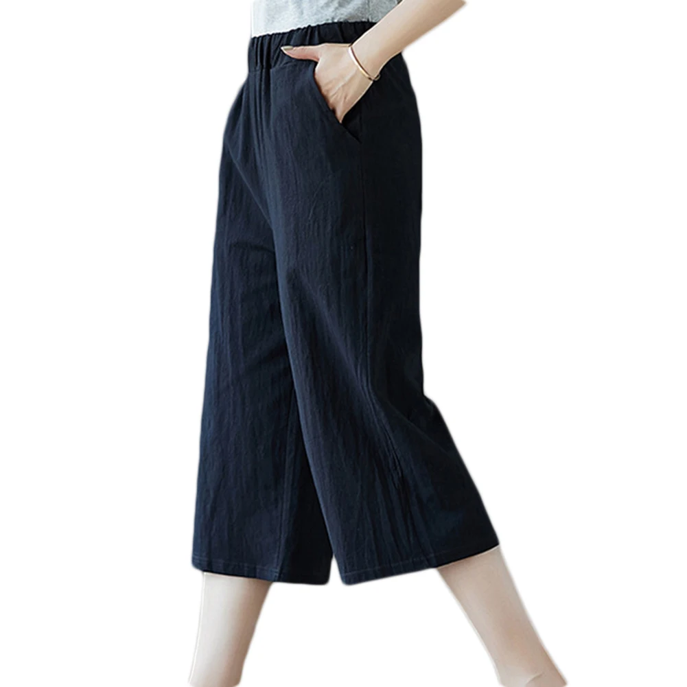 Летние женские эластичные свободные широкие прямые однотонные Капри брюки