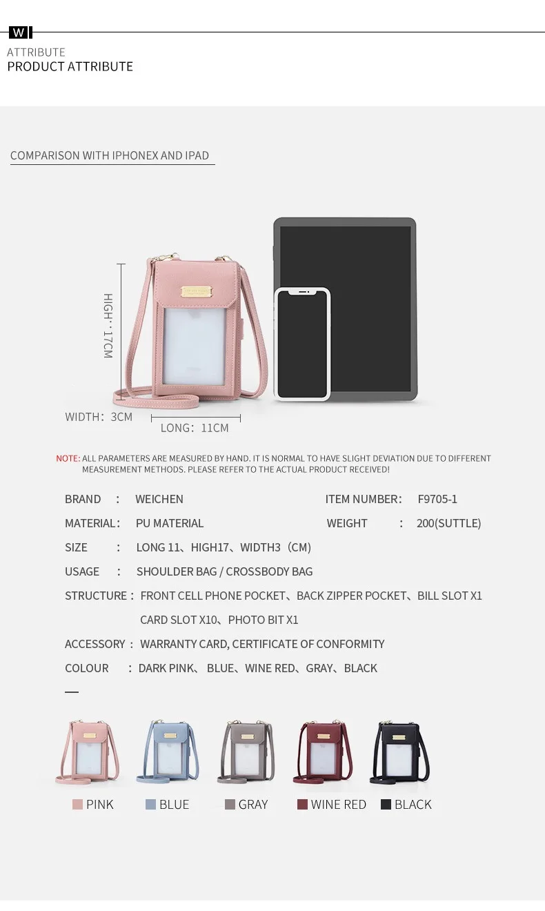 Артикул: WC-06 Название: сумка на плечо Размеры: 11X17X3 см Материал: из искусственной кожи Вес нетто: 200 г Скидка: Скидка 10% на 3 шт., скидка 50% на 50 шт. Обратите внимание: 1. Пожалуйста, ознакомьтесь с нашей таблицей размеров перед покупкой. 2. Перед оплатой проверьте правильный адрес. Внимание: 1. Из-за различных методов измерения, положения и ткани Растягивается, данные могут отличаться на 1-2 см. Таблица размеров приведена только для справки. 2. Разница в цвете может существовать между различными компьютерными дисплеями, пожалуйста, превалирует. 3. Пожалуйста, обратитесь к Цельсия и Фаренгейта): 1 дюйм = 2,54 см или 1 см = 0,39 дюймов