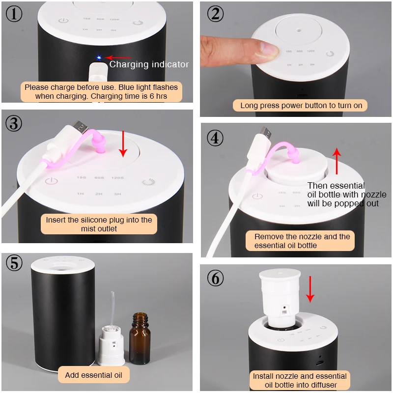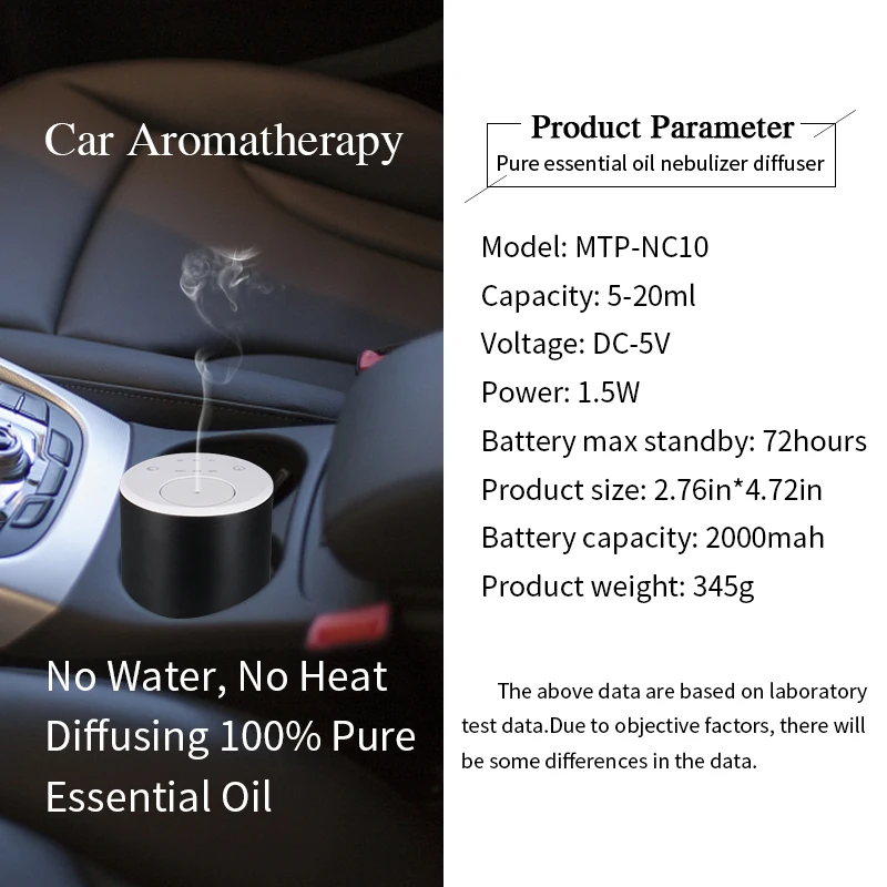 Модель: MTP-A-NC10 Материал: алюминиевый сплав + ПП + ПБТ Источник питания: DC USB 5V 1A Размер изделия: D70 * h120мм Длина USB: 100 см (пробка входит в комплект) мощность: около 3 Вт Время заказа: 6 ч Емкость аккумулятора: 18650 2000mahlithium-ионный аккумулятор Емкость эфирного масла: 5 мл, 10 мл, 15 мл, 20 мл Прерывистый режим: 15s ВКЛ./165s ВЫКЛ., 60s ВКЛ./120s ВЫКЛ., 120s ВКЛ./60s ВЫКЛ. Режим таймера: 1 ч 2 ч 3 ч непрерывная работа Время работы: 72H, 16H, 8H при полной зарядке Покрытие: около 100 ~ 1000 кв. Футов Цвет: серый, синий, черный, красный, розовое золото, фиолетовый, шампанское золото, розовый аппликатор Характеристики продукта: безводный, беспроводной, перезаряжаемый, портативный Примечание: можно использовать только 100% чистое эфирное масло.