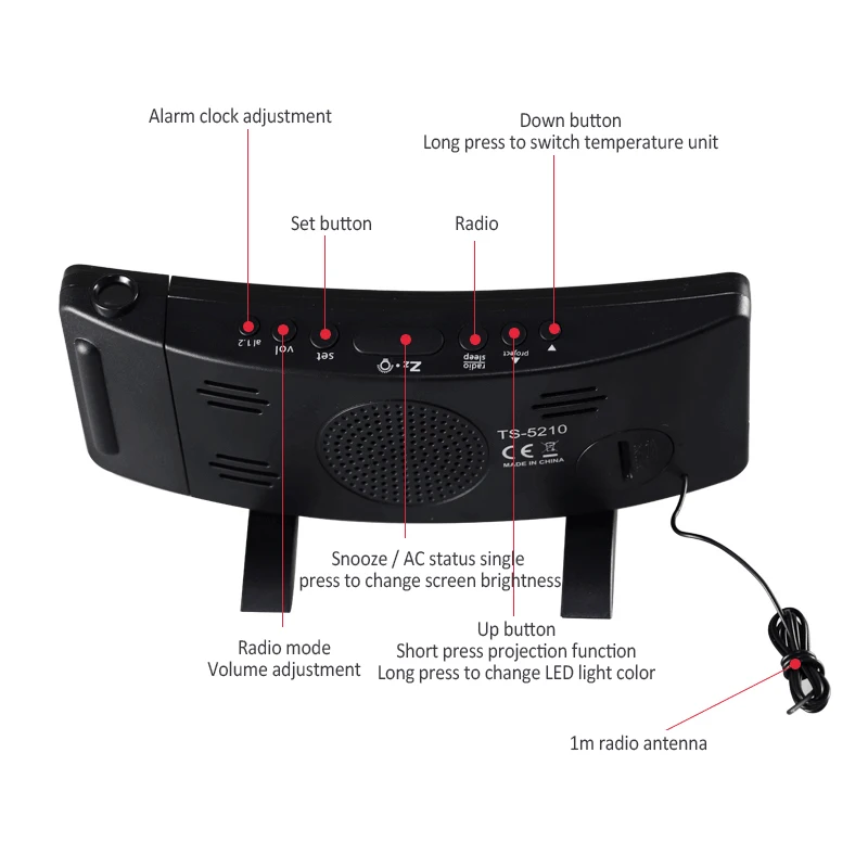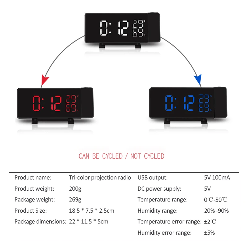 Особенности 1. Девять функций: проекция/подсветка/время/повтор/вращение проекции/температура/Влажность/зарядка от USB/питание от постоянного тока 2. Повтор/состояние переменного тока одно нажатие для изменения яркости экрана 3. Функция проекции: проекция может поворачиваться вперед и назад на 90, лучшее расстояние проекции 2 м. 4. Функция fm-радио: оснащен 1 м радиоантенной, когда сигнал не хороший, вы можете расширить антенну для радио 5. Два будильника: два будильника можно установить: 1. Нажмите кнопку AL1.2. Светильник A1 включится, и часы будут мигать. Нажмите ▲ и adjust Отрегулируйте часовое значение будильника, а затем нажмите кнопку AL1.2 снова, минуты будут мигать. Нажмите AL1.2 снова, чтобы отобразить выключение, нажмите ▲ и ▼, чтобы выбрать режим будильника 2. Повторите вышеуказанные шаги для завершения настройки Alarm2 Технические характеристики Название продукта: трехцветное проекционное радио Выход USB: 5 В 100 мА Источник питания постоянного тока: 5 В Диапазон температур: 0 ℃-50 ℃ Диапазон влажности: 20% -90% Диапазон погрешности температуры: ± 2 ℃ Диапазон погрешности влажности: ± 5% Вес изделия: 200 г Вес посылки: 269 г Размер изделия: 18,5*7,5*2,5 см Размеры посылка: 22*11,5*5 см