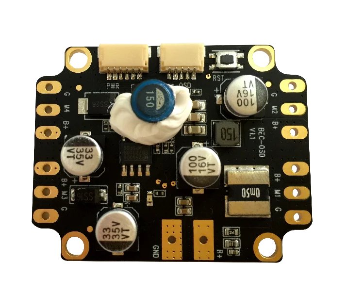 Это плата распределения питания, построенная в UBEC и OSD. Выходное напряжение UBEC составляет 5,3 В, интегрированный датчик напряжения и тока для контроллера полета.