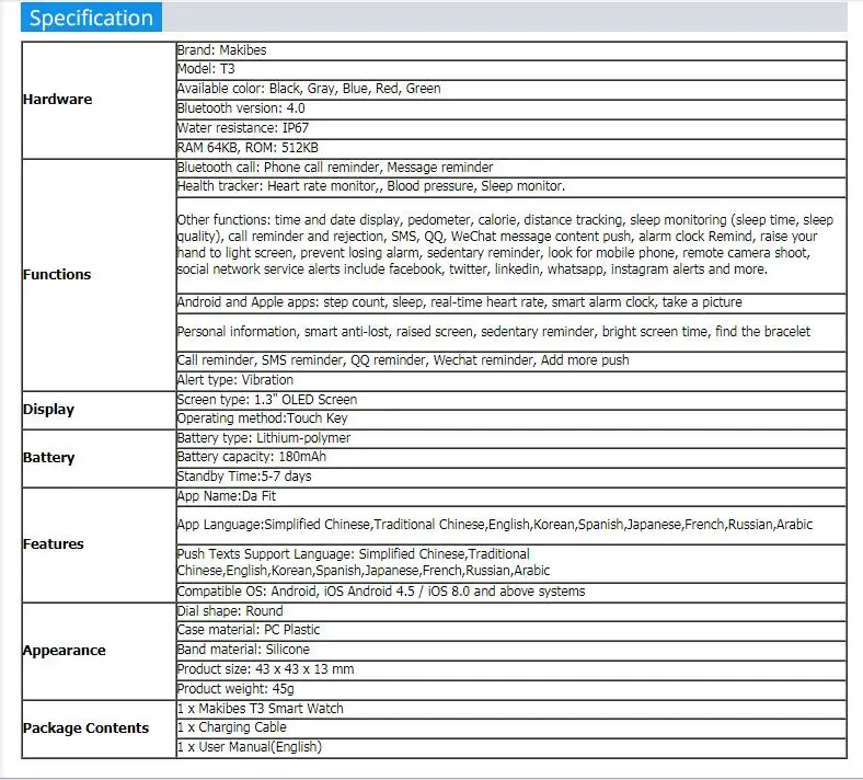 Подробнее об изделии Новый цветной экран умный Браслет кровяное давление монитор сердечного ритма здоровье трекер Браслет для Android iOS В наличии! Отправка в течение 24 часов! Особенности: 1,3 дюймовый круглый ips экран 1,3 дюймовый круглый полный сенсорный экран с высоким разрешением, делает отображаемое содержимое более ярким и красивым. Большой экран, подходит для ширины запястья, создает приятные ощущения от ношения. Монитор сердечного ритма в реальном времени/монитор артериального давления/Монитор кислорода в крови Он может точно контролировать импульсы и активные изменения частоты сердечных сокращений и пульса отдыха, чтобы создать профессиональный отчет о частоте сердечных сокращений. Поддерживает монитор кровяного давления и монитор кислорода в крови (это непрофессиональное медицинское оборудование, данные о кровяном давлении только в качестве справки). Монитор наблюдения за сном Он отслеживает качество вашего сна путем измерения длительности глубокого сна, безынтерного сна и состояния бодрствования. Несколько спортивных режимов Имеет 8 спортивных режимов: плавание, бег, прогулки, футбол, прыжки, бадминтон, баскетбол, Велоспорт. Имеет функции шагомера, расстояния, калорий, секундомера. IP67 Водонепроницаемый Он может легко работать с ежедневной гидроизоляцией (он не может плавать или контактировать с горячей водой и подходит для нормальной холодной воды окружающей среды). Длительное время работы в режиме ожидания Аккумулятор 180 мАч, длительное время работы в режиме ожидания до 5-7 дней в обычной ситуации, экономит частые проблемы с зарядкой. Больше функций Bluetooth Push: входящие звонки, сообщения, Wechat, QQ, Skype, WhatsApp, Facebook, Linkedin, Twitter, Viber, line notification. Напоминание о малоподвижности, напоминание о собрании, поиск часов, Поиск телефона, ручной светильник и т. Д.