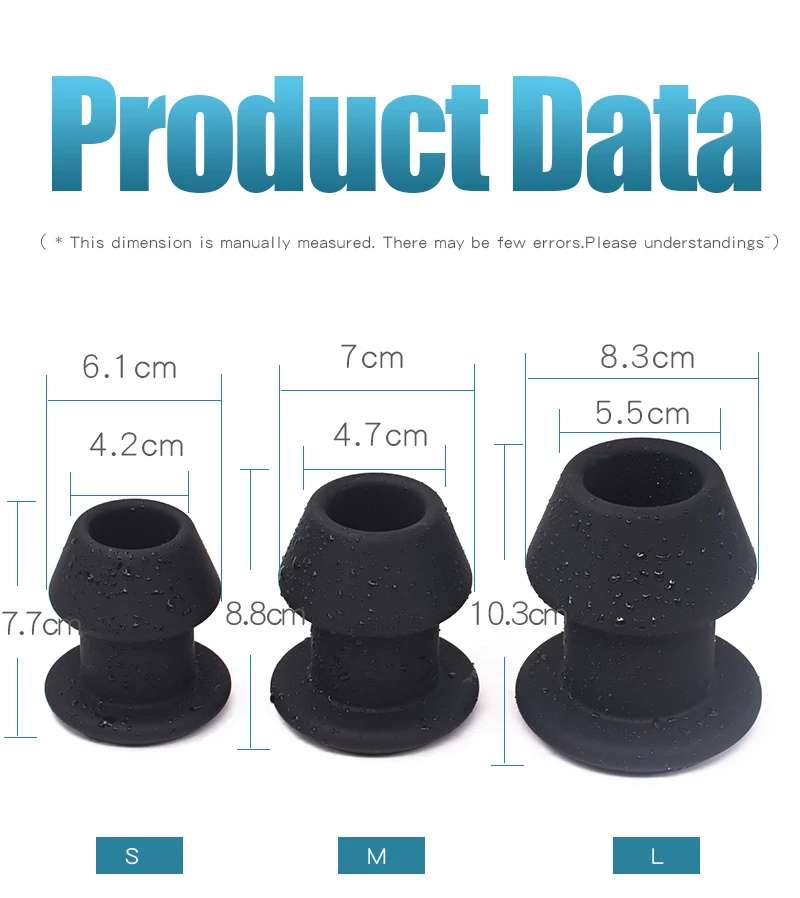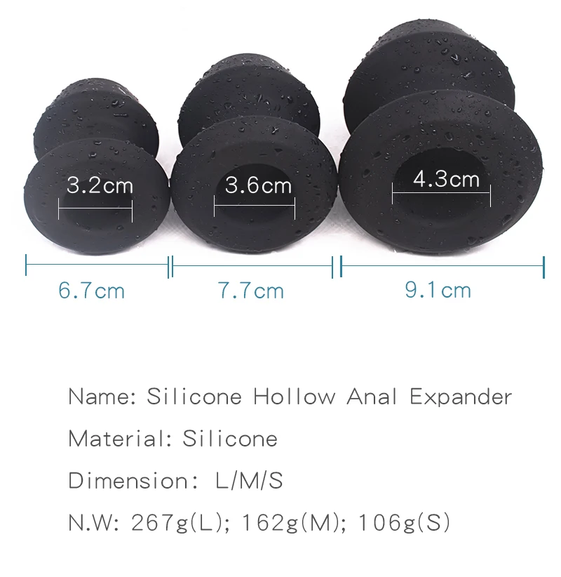 Material:silicone Colors:Black Total length: 7.7cm(S); 8.8cm(M); 10.3cm(L) Hollw diameter: 3.2cm(S); 3.6cm(M); 4.3cm(L) Weight: 106g(S); 162g(M); 267g(L) Features: -Hollow channel. Peep into anus/women privates; Insert something funny in to tease, such as fingers, vibrator or other; -3 Specifications. Put 5 fingers? 4 fingers? 3 fingers? specific number is based on the size of the fingers and plug; -Enema cleaning. Channal design is good for douching, big size is easier to clean; -Moderate soft, designed with a strong coordination. No too soft to support, no too hard to hurt; -Silky/Smooth tactile, very comfortable. no sharped edges, no harm for private parts; -Quality silicone. Excellent resilent and skin-friendly, freely pinch without deformation. -SM pleasure. Develop new game for anus, super large sizes, too big to control in one hand; -Visual presentation. Looks so amazing, there is a big space in the anus to expand, breathtaking thrill. USAGE: Full lubricate, and slowly insert.