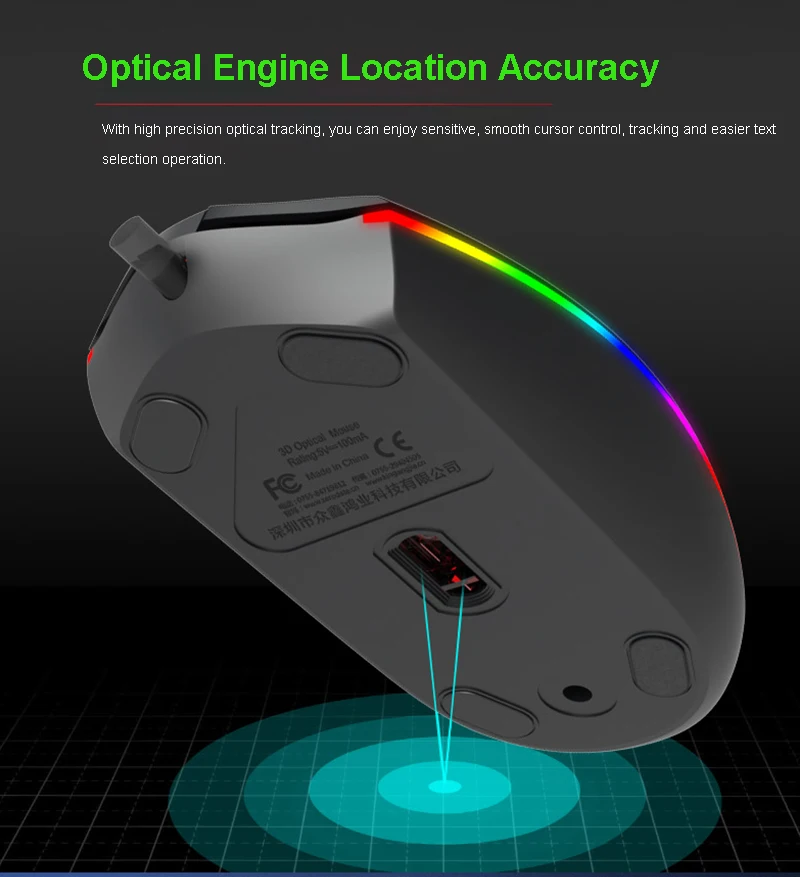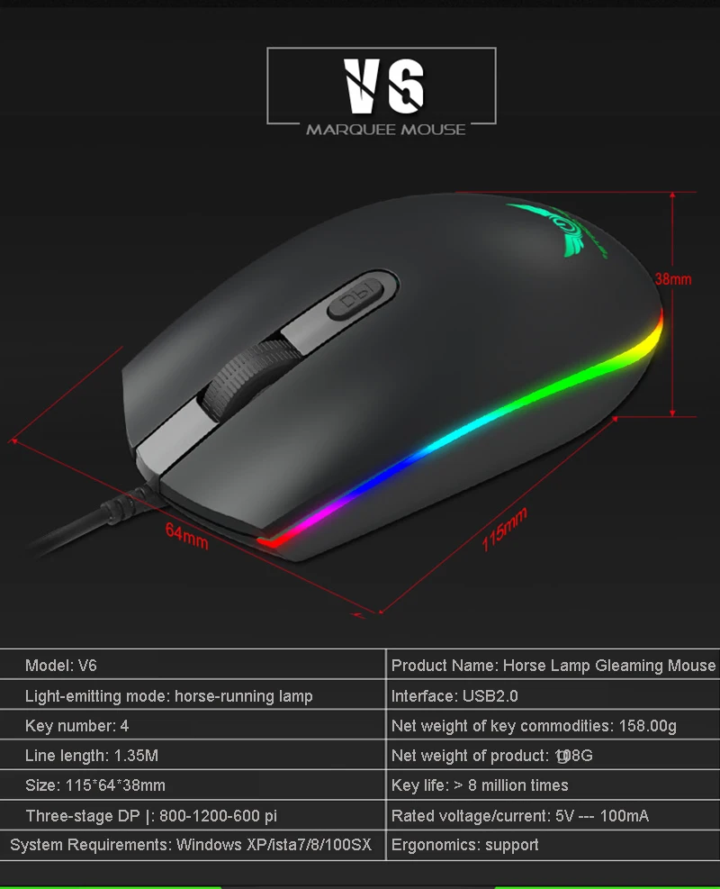 Спецификация: Модель: V6 Цвет: черный Тип подключения: проводной Режим освещения: потоковая передача RGB Интерфейс: USB 2,0 Кнопки с цифрами: 4 кнопки Время работы кнопки: ≤ 8 миллионов раз 3 режима DPI: 800-1200-1600 DPI Номинальное напряжение/ток: 5 В/100 мА Системные требования: для Windows XP/Vista 7800s Эргономика: Поддержка Вес нетто: 158 г Размер продукта: 115X64X38 мм/4,53X2,52X1,50'' Примечания: 1. Из-за различного эффекта на мониторе и светильник, фактический цвет изделия может отличаться от цвета, представленного на фотографиях. Спасибо! 2. Допускается отклонение в 1-3 мм, так как измерения выполнены вручную. Упаковка: 1 X проводная мышь