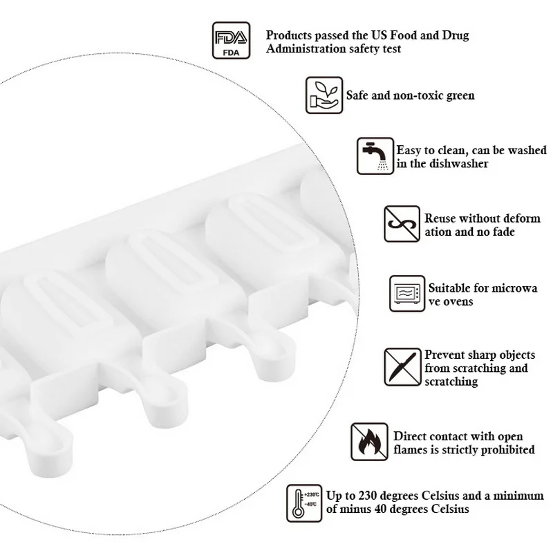 1. Food grade silicone: This ice cream mold is made of food grade silicone, the material is nontoxic, eco-friendly and odourless. Safe and healthy for you and your family.