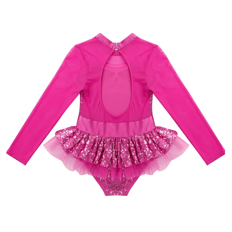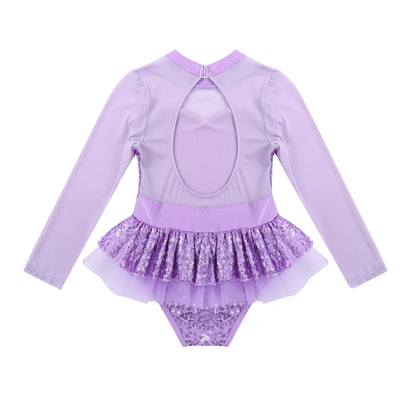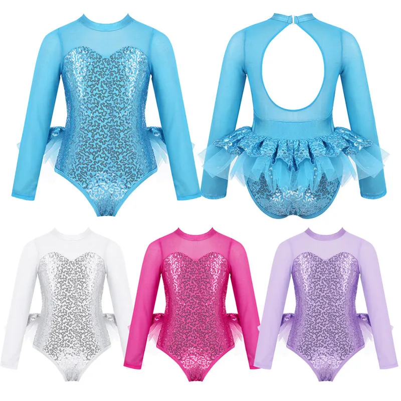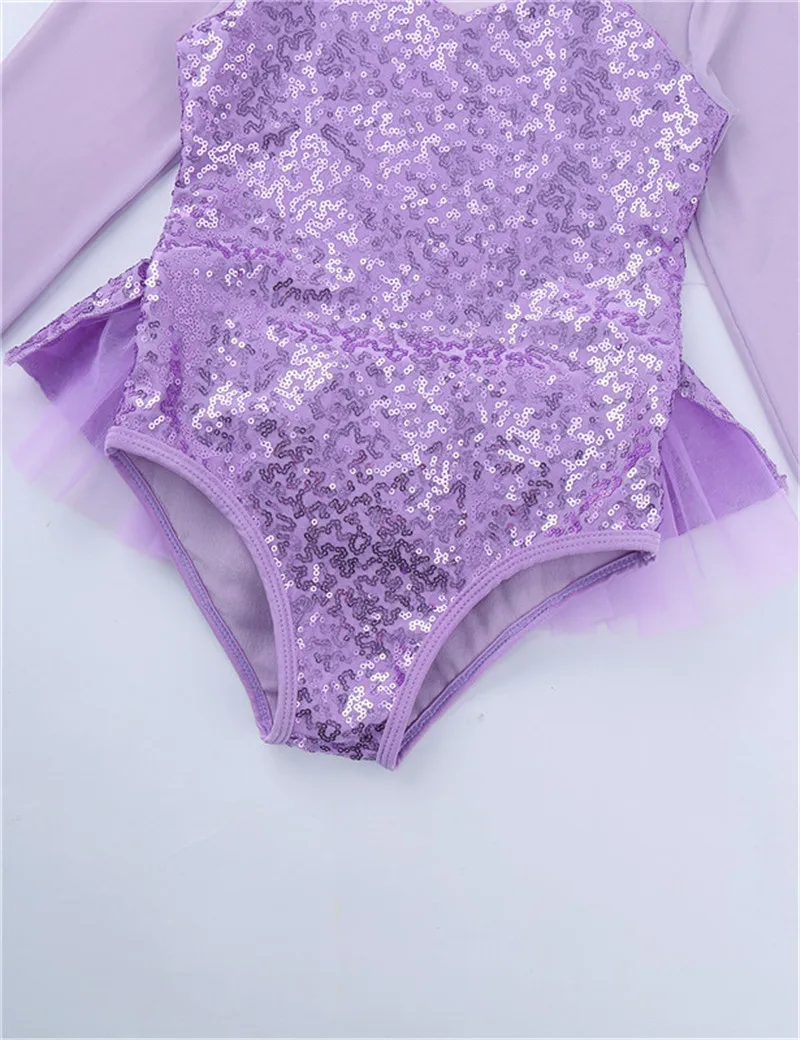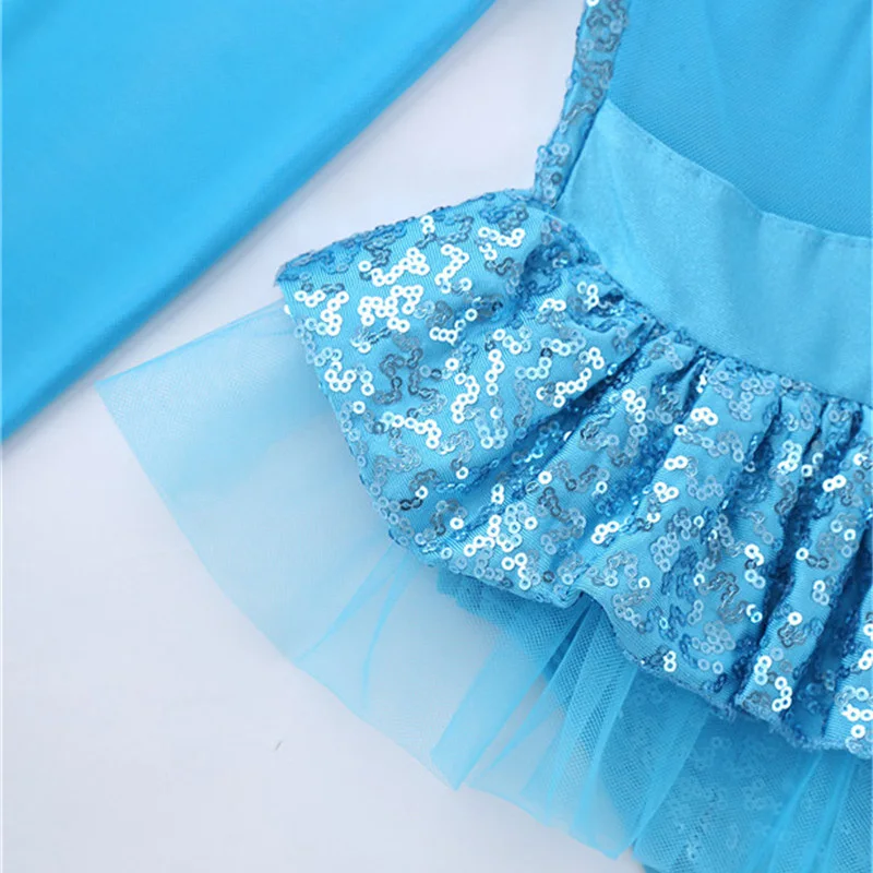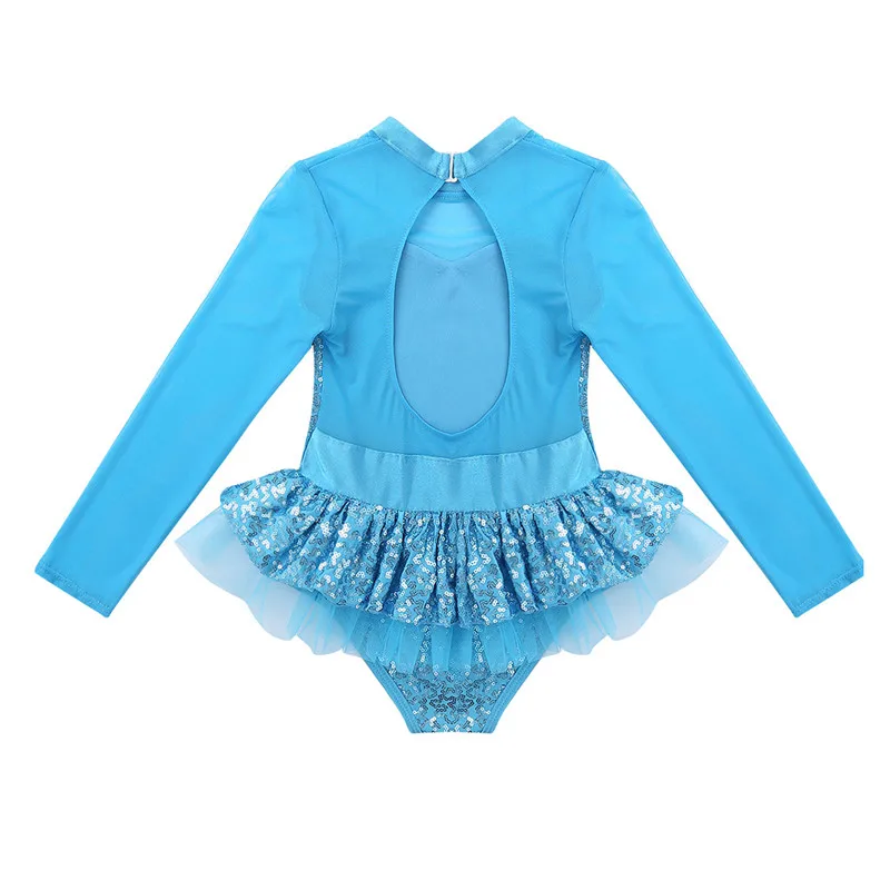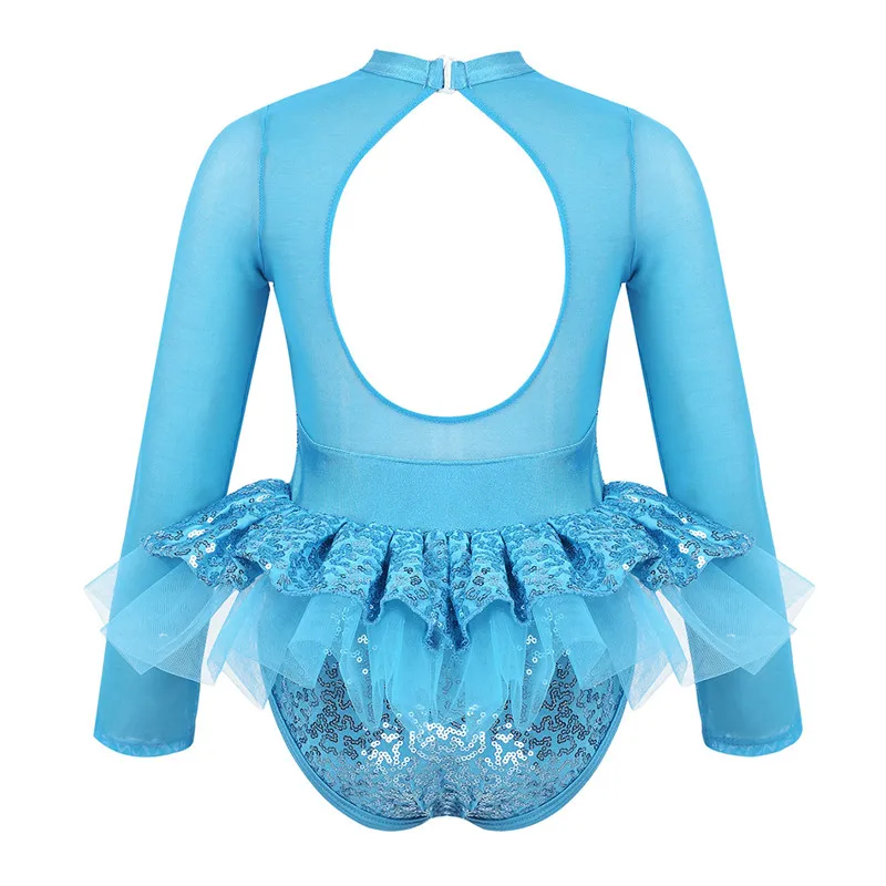 Детское фатиновое трико с длинными рукавами и блестками для девочек, с вырезом на спине, для современного бального танца, сцены