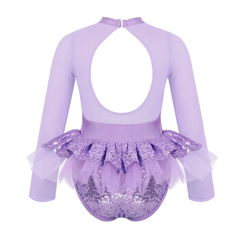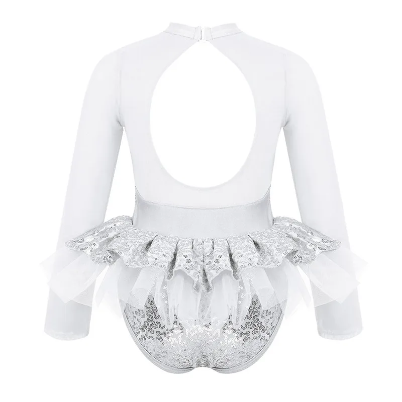 Полупрозрачный дизайн из тюля. Вырез на спине. Ярусные оборки, прикрепленные вокруг талии сзади. Красивая и блестящая танцевальная одежда для вашей девочки.