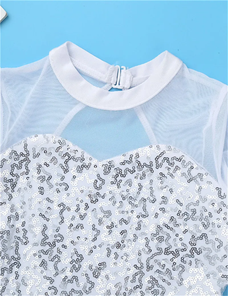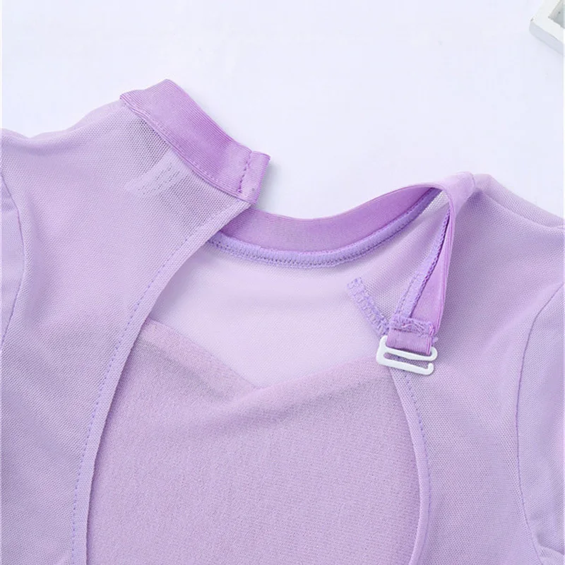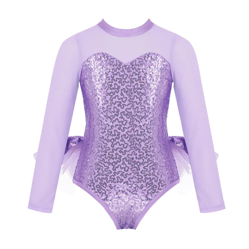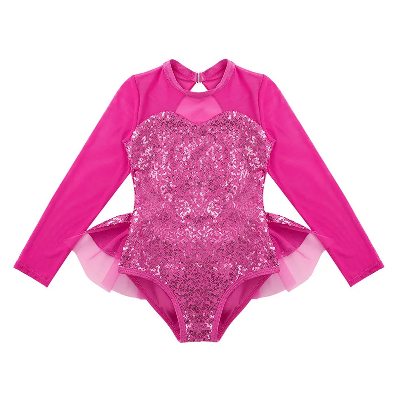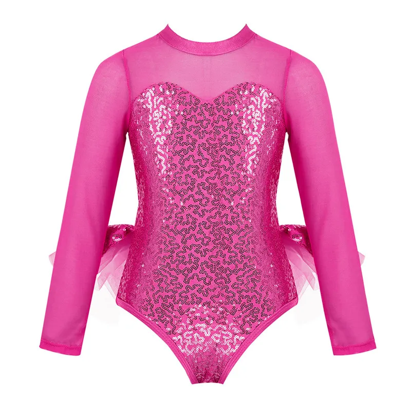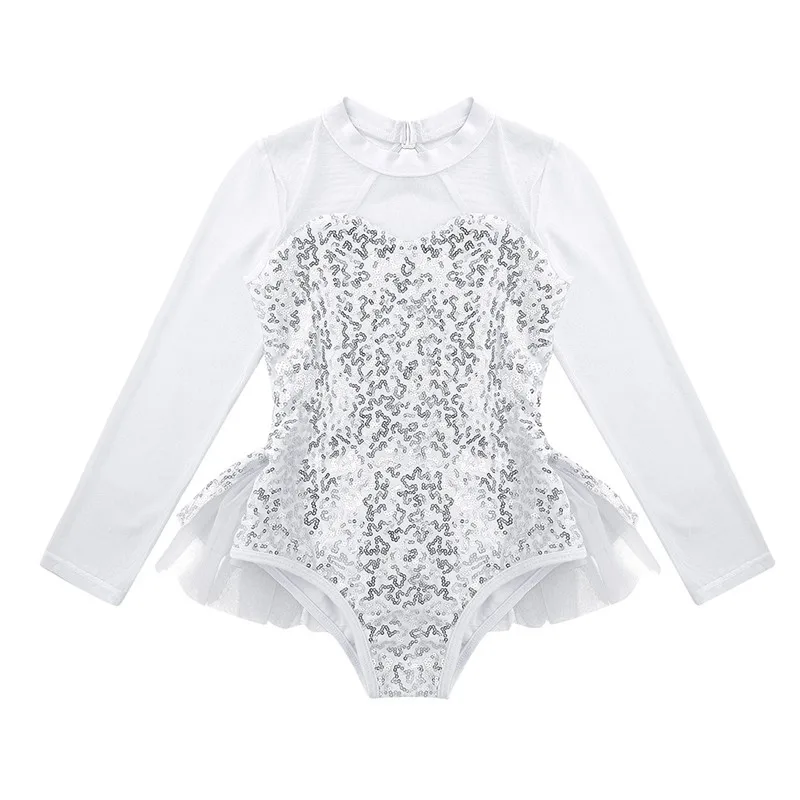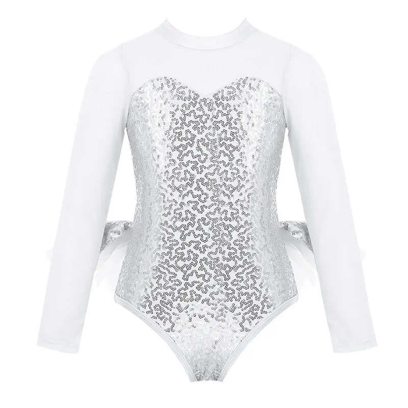Прозрачные длинные рукава, ложная горловина с застежкой. Трико украшено блестящими пайетками, милая грудь. С подкладкой для удобного ношения.