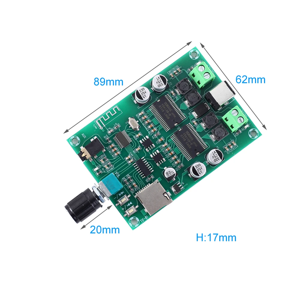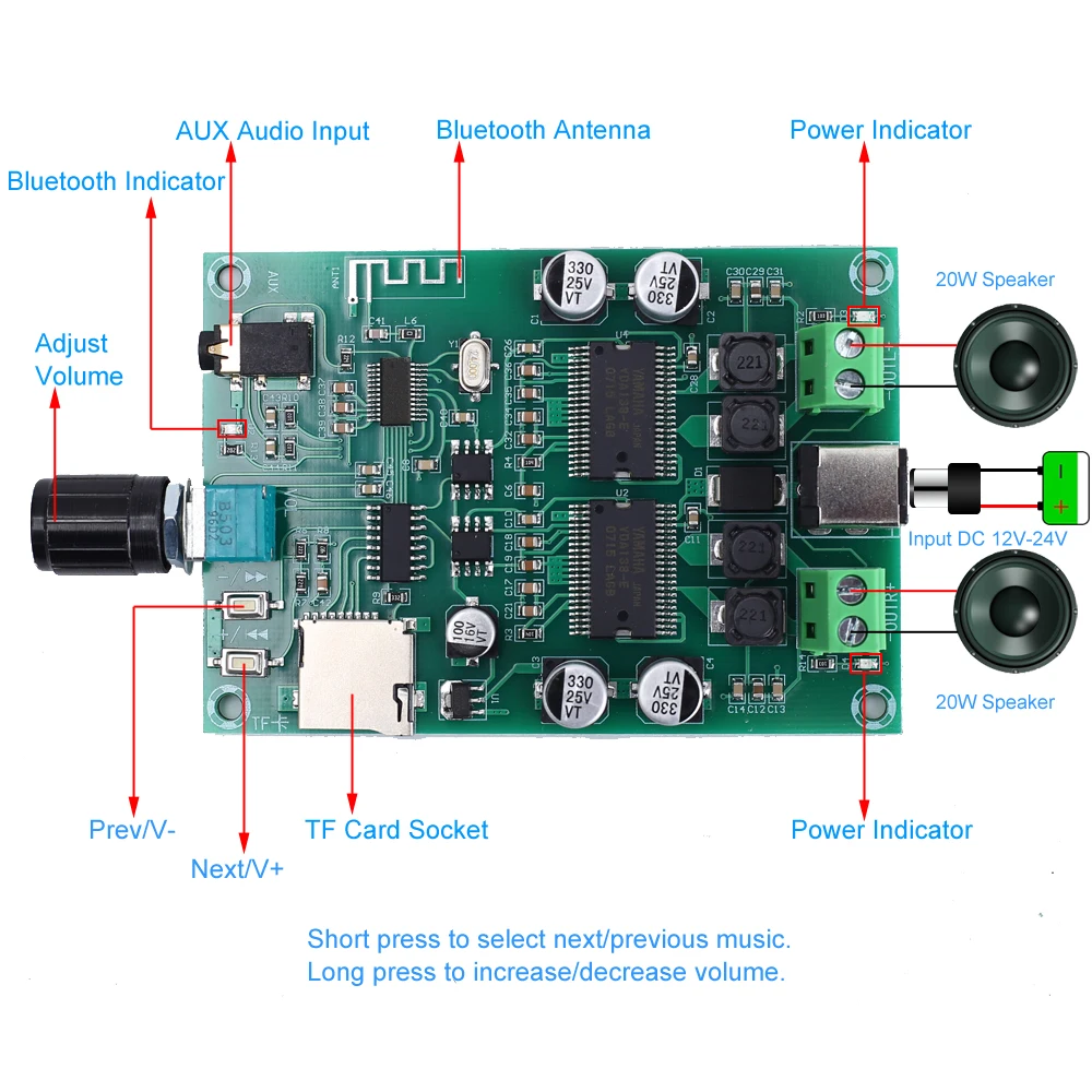 1. Описание: XH-A354-это плата цифрового усилителя мощности Yamaha. Она имеет встроенный модуль усилителя, который может непосредственно управлять динамиком 2. Особенности: 1>. Встроенный усилитель 2>. Двухканальный стерео 3>. Регулировка громкости 3. Параметры: 1>. Модель: XH-A354 2>. Рабочее напряжение: DC 12 V-24 V 3>. Рабочий ток: 4А 4>. Ток в режиме ожидания: 80 мА 5>. Контроллер IC: YDA138-E 6>. Выходной канал: двухканальный стерео 7>. Выходная мощность: 20 Вт * 2 8>. Выходное сопротивление: 4 Ом 9>. Эффективность работы: 88% 10> Рабочая температура:-25℃ ~ 85℃ 11>. Рабочая влажность: 5% ~ 95% относительной влажности 12>. Размер: 71*35*15 мм 4. Часто задаваемые вопросы: 1>. Почему громкость работает нормально, когда громкость маленькая, и есть пауза после увеличения громкости? В: искажение звука. Причина 1: источник питания слишком низкий. Рекомендуется использовать источник питания 24 В и убедиться, что входной ток превышает 4 А. Причина 2: мощность динамика слишком низкая. Необходимо подключить к 20 Вт динамику. Искаженный звук или даже повреждение динамиков, если просто подключить 5 Вт динамик. 5. Посылка: 1>. 1 шт. XH-A354 Yamaha цифровой усилитель мощности