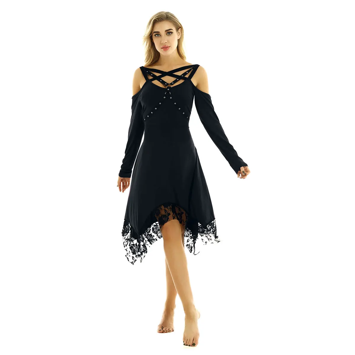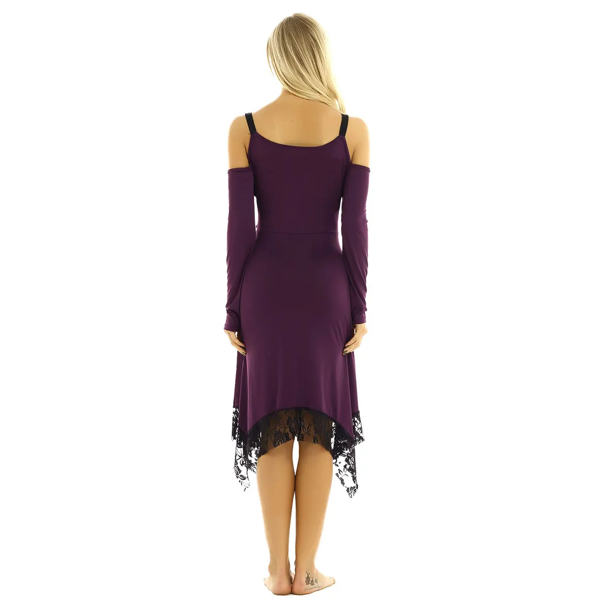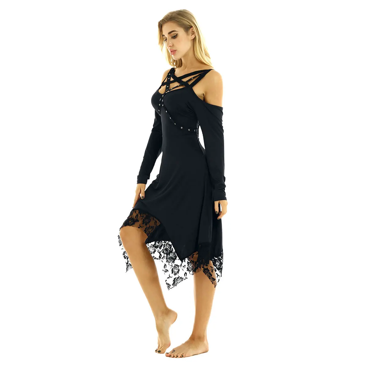 Купить ChicTry Women Long Sleeves Off the Shoulder Irregular Lace Hem Vintage Gothic Ballroom Party Performance Solid Color Dance Dress |