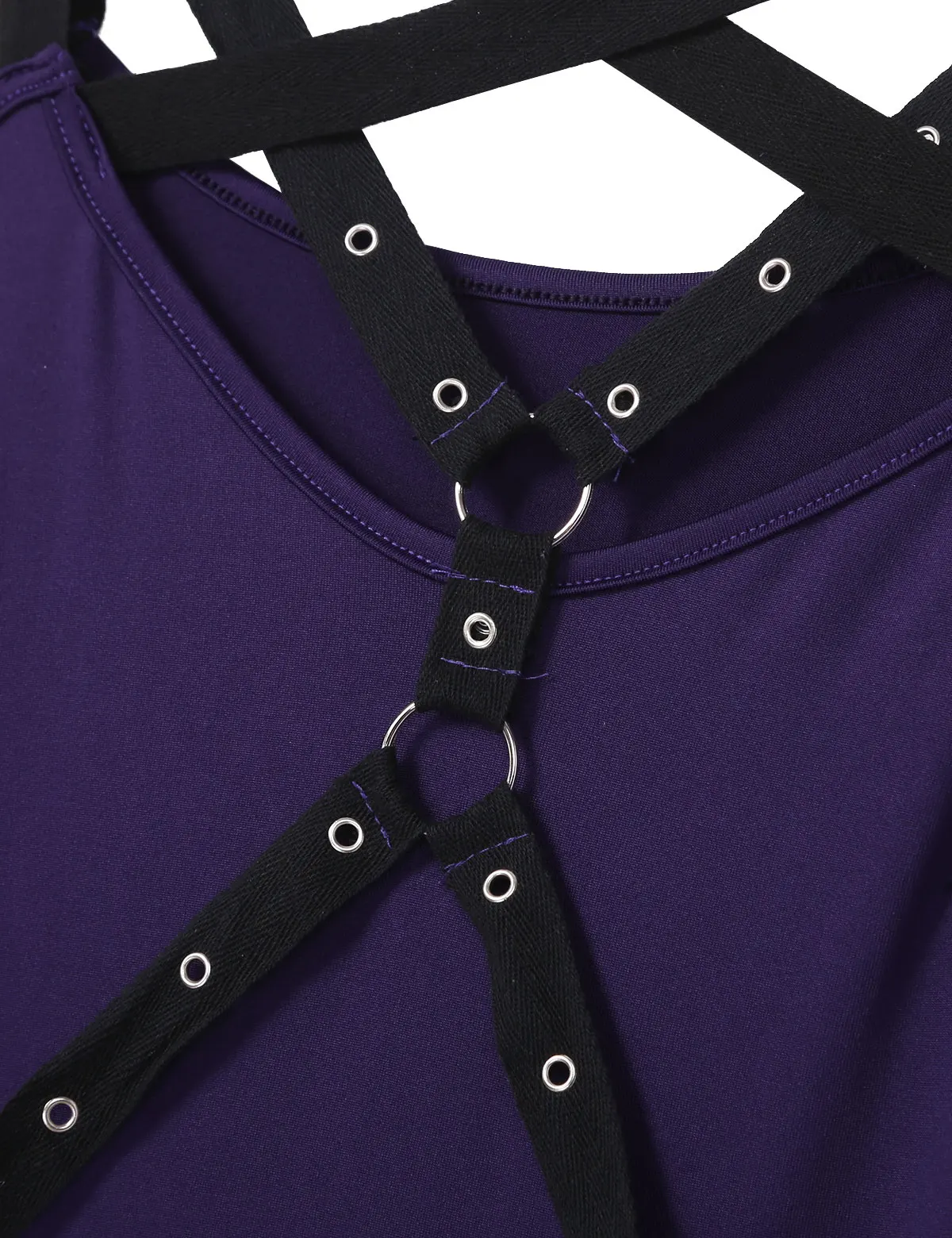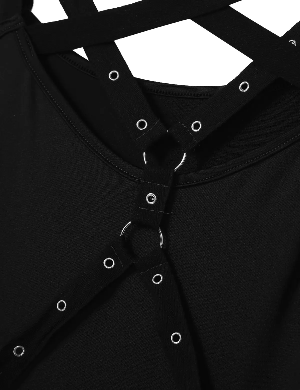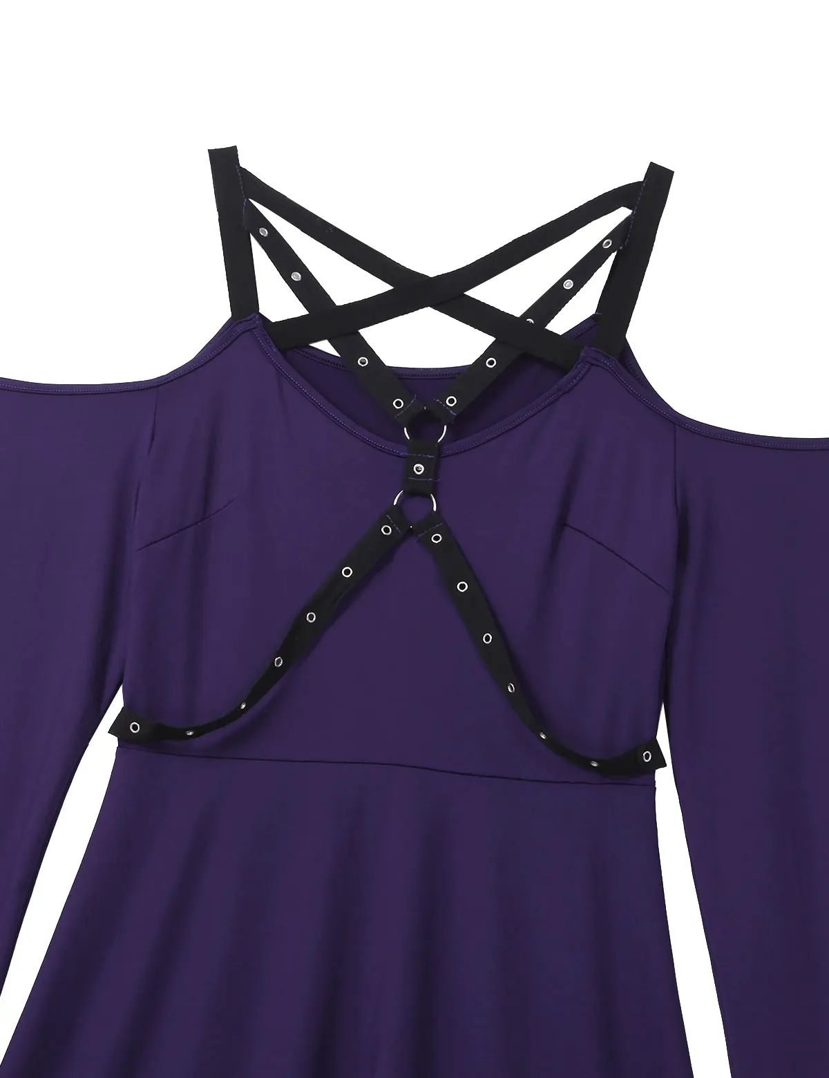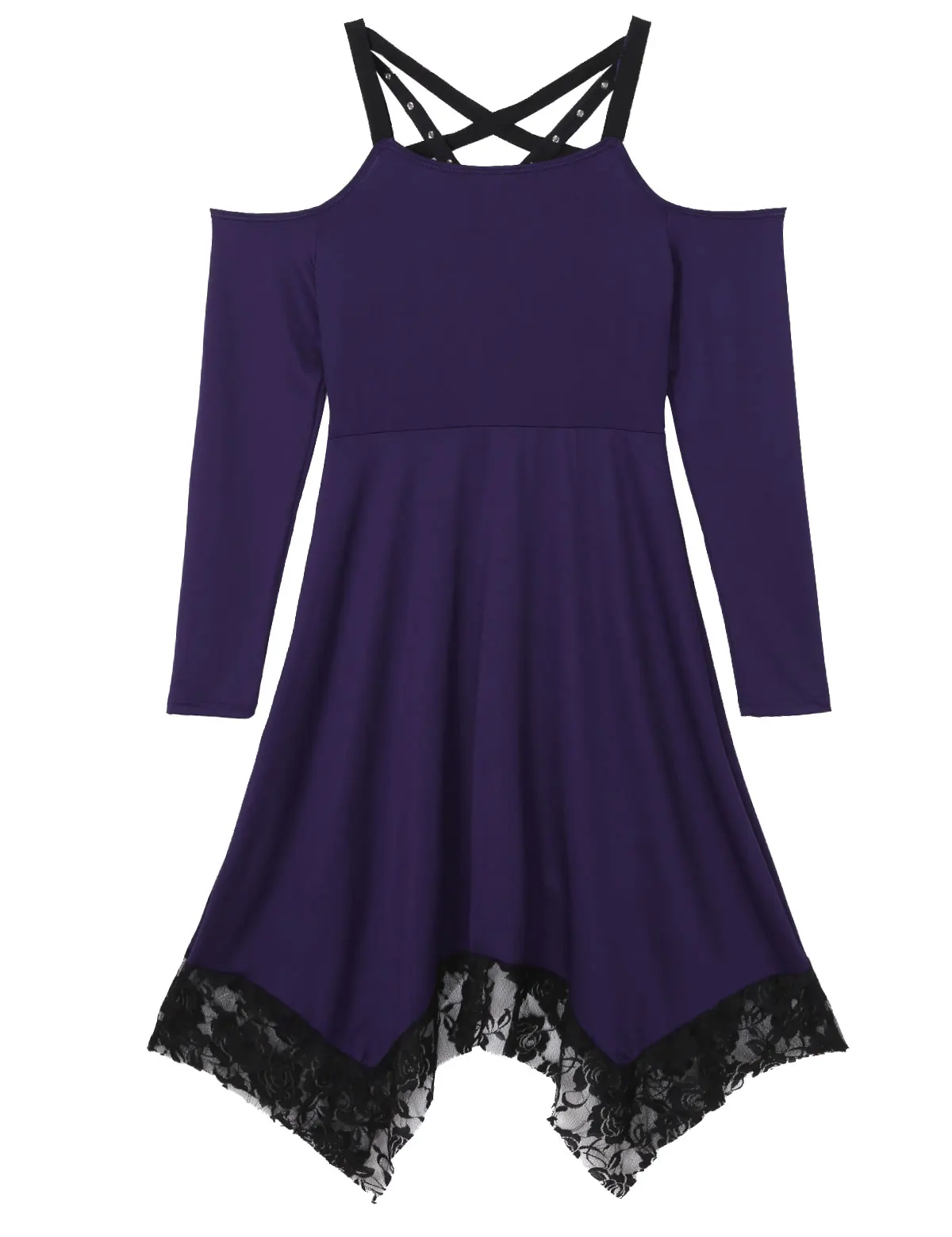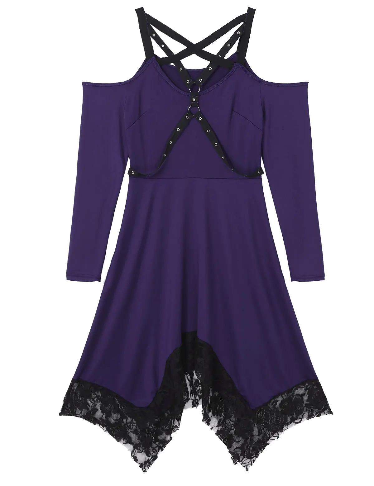 Off shoulder with long sleeves, multi-strap details at front, irregular lace hemline, solid color and midi length.