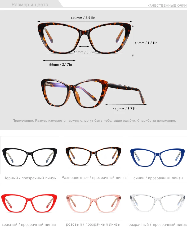 Сексуальная и модная кошачьи глазная форма, оправа изготовлена из пластика титана, который обладает хорошей гибкостью. Шарнир использует пружинный шарнир для более удобного ношения. Объектив использует смолу против синего света, 100% UV400 защиты, подходит для компьютерных работников, мобильных телефонов, повседневной одежды и так далее. Линзы могут быть заменены на рецептурные линзы. О размере Ширина рамки: 140 мм / 5,51 дюйма Ширина объектива: 55 мм / 2,17 дюйма Высота объектива: 46 мм / 1,81 дюйма Ширина моста: 15 мм / 0,59 дюйма Длина храма: 145 мм / 5,71 дюйма Ты можешь получить: Очки * 1, футляр для бутиков * 1, ткань для очков * 1, сумка для очков * 1