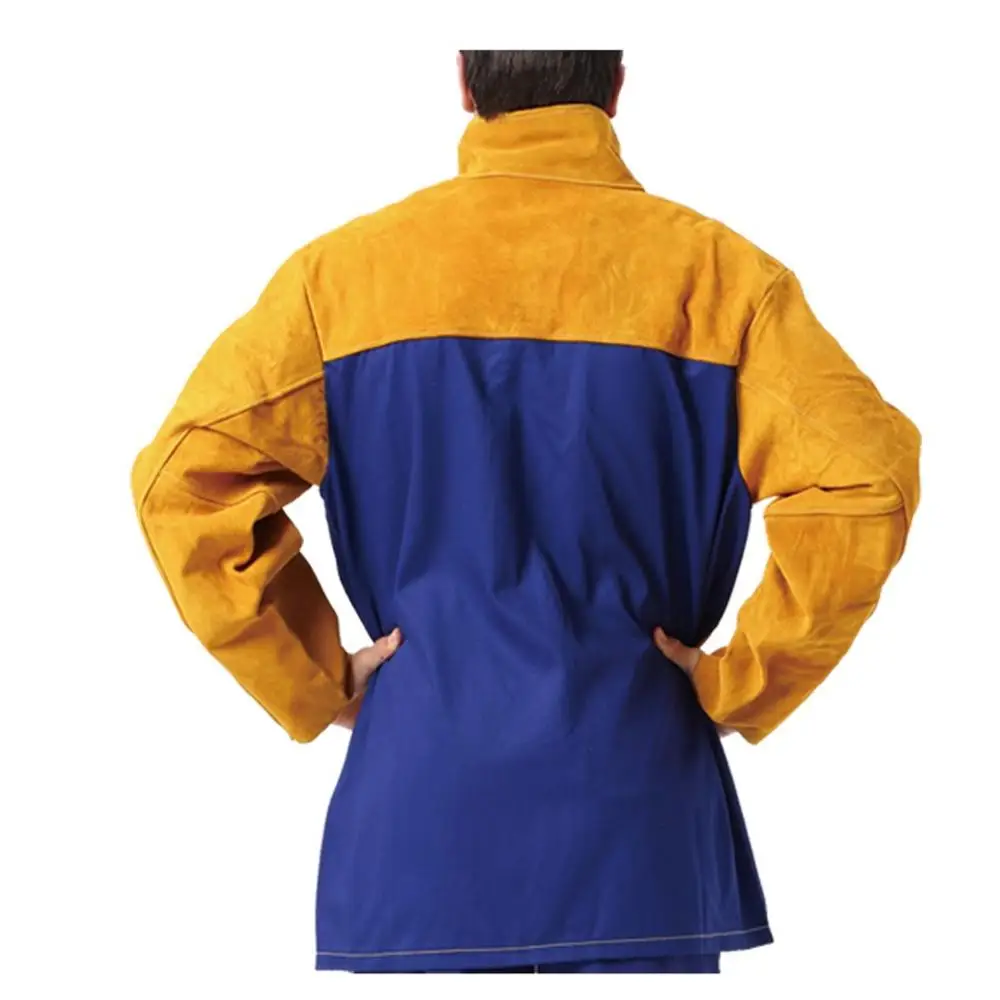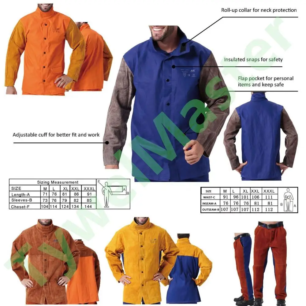 Спилок из воловьей кожи высшего сорта и 10 унций. Каркасный Гибридный хлопокСварочный кожух, меньший вес, но такая же защита. Подвернутый воротник для защиты шеи. Изолированные защелки для безопасности. Карман с клапаном для личных вещей и сохранения безопасности. Регулируемая манжета для лучшей посадки и работы