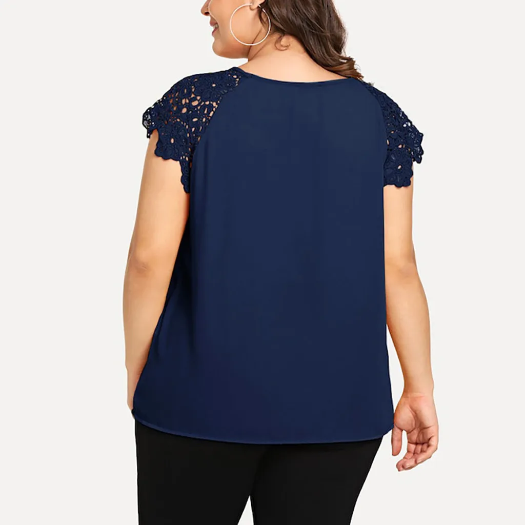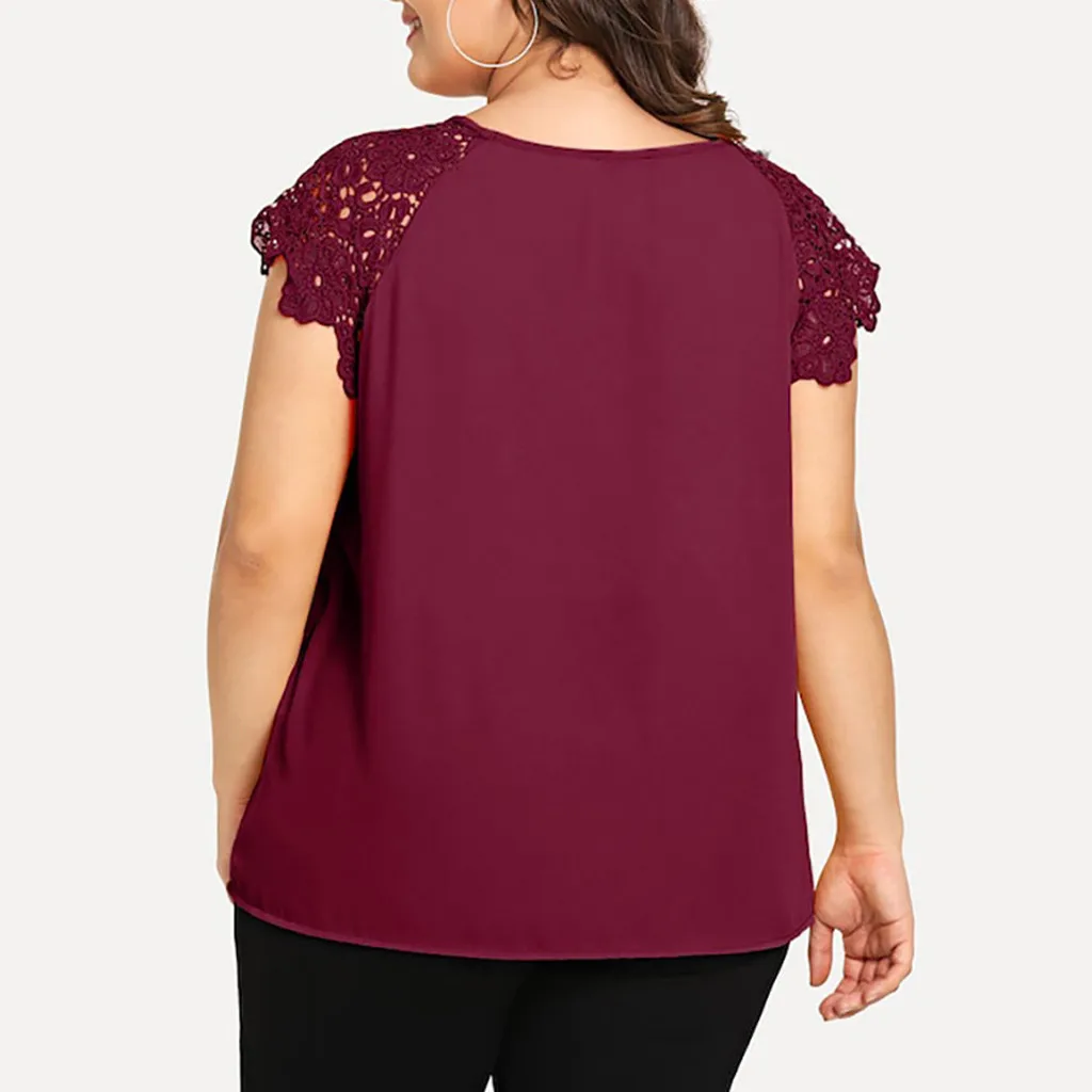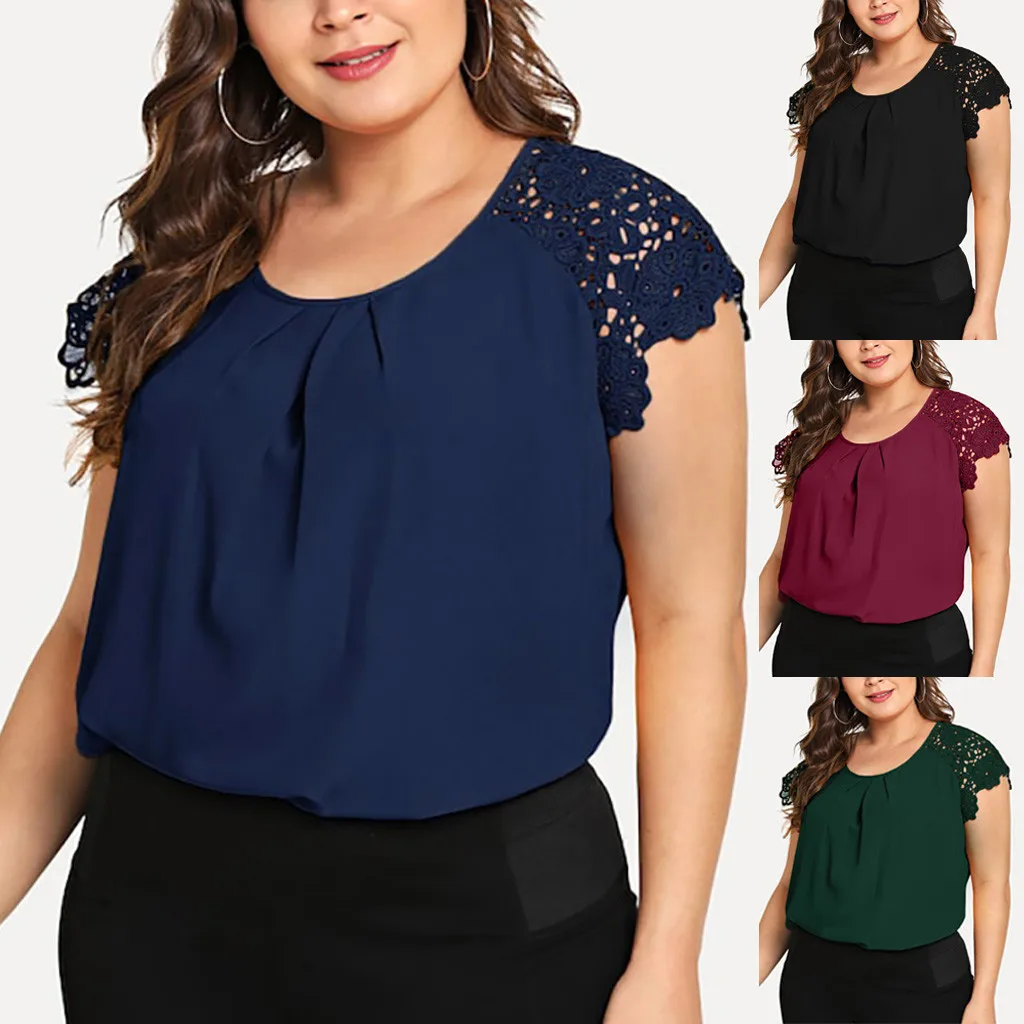 1,1. Особенности: футболка размера плюс, с кружевным рукавом, круглым вырезом, однотонная, с цветочным кружевом на плечах, пуловер, повседневные топы, повседневная одежда, стильный и модный дизайн, Летняя Повседневная блуза.