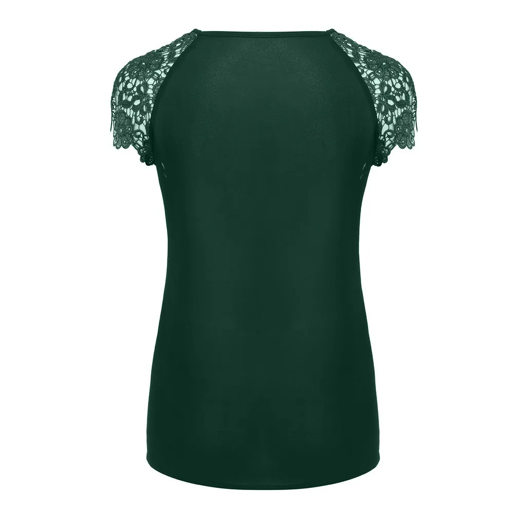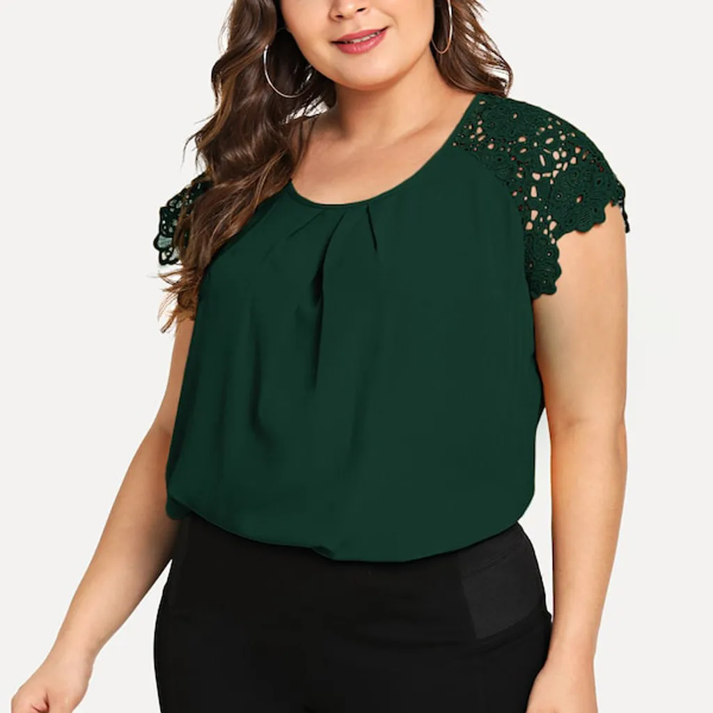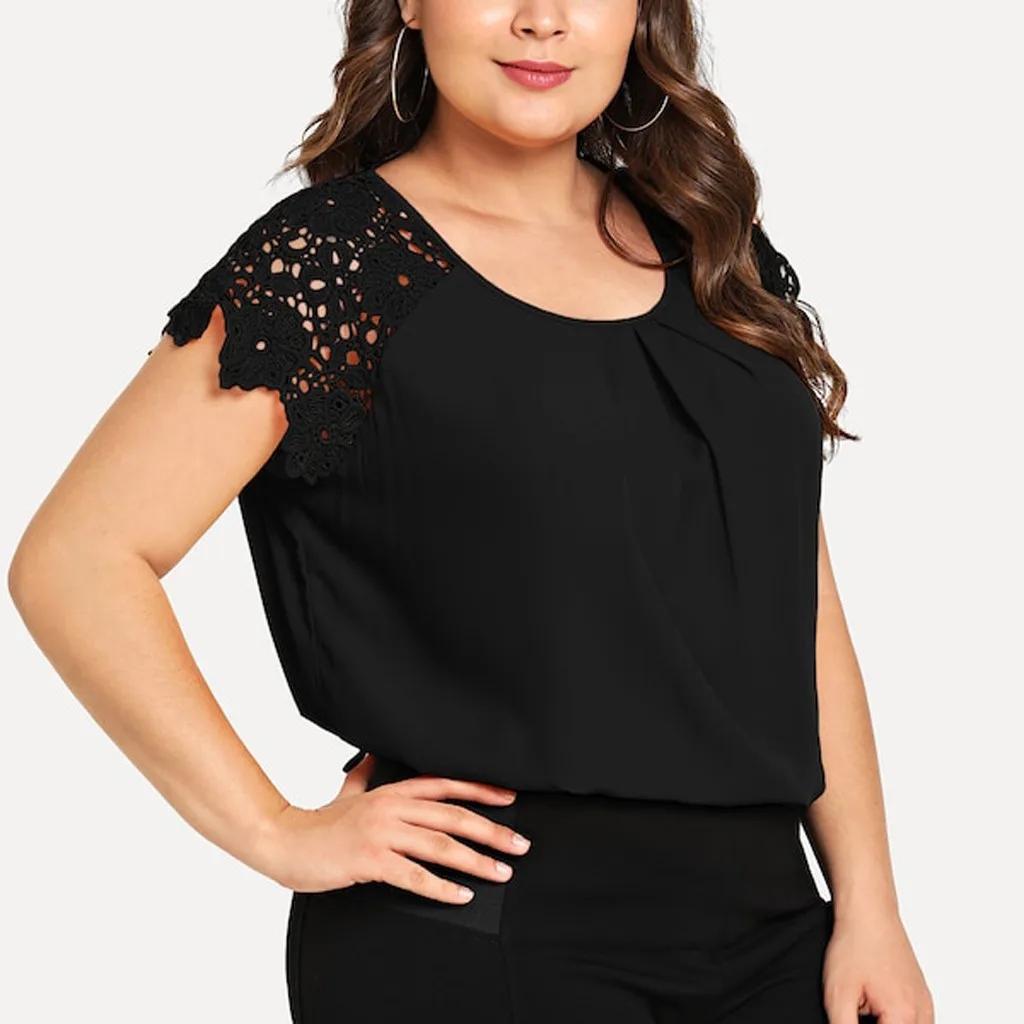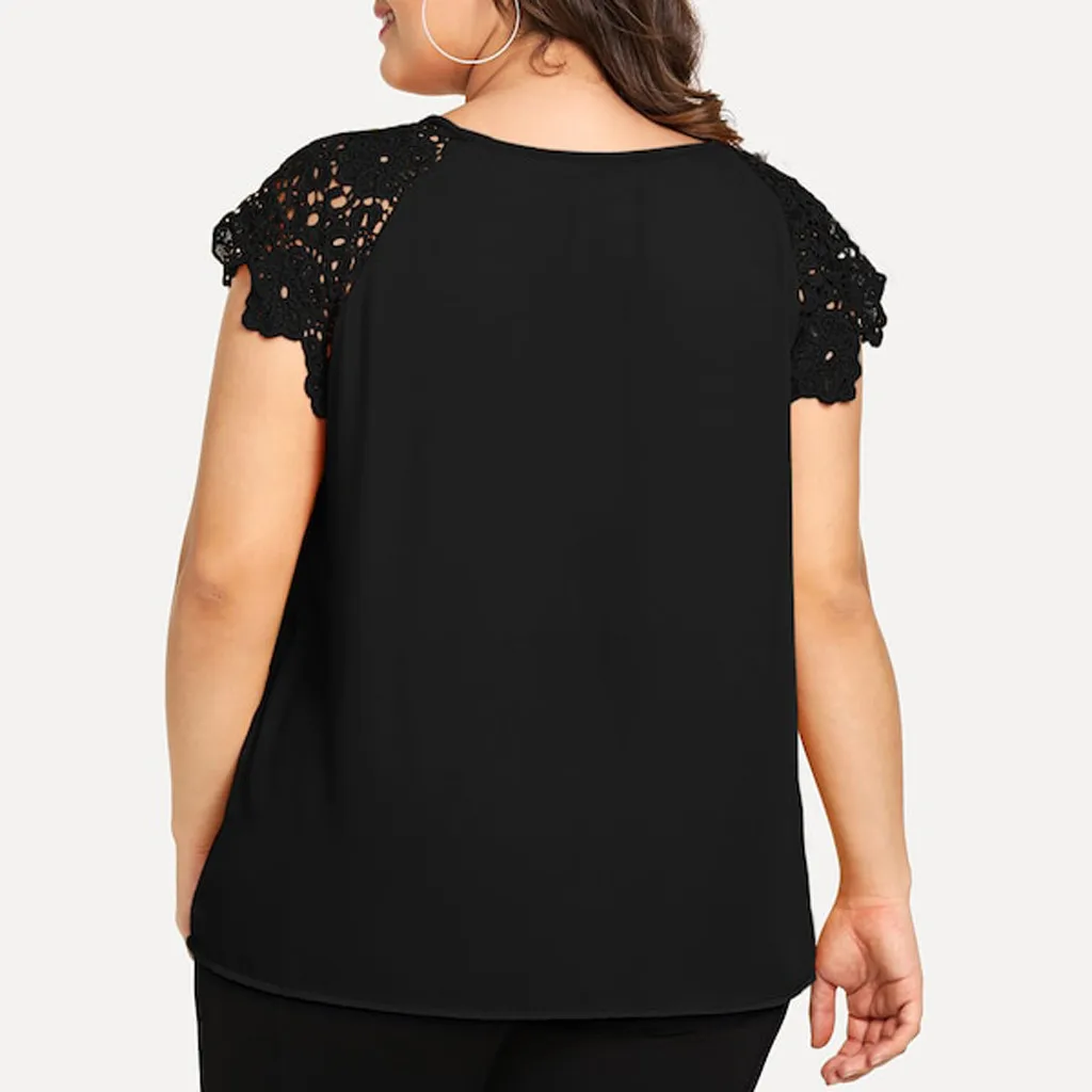 1,1. Особенности: футболка размера плюс, с кружевным рукавом, круглым вырезом, однотонная, с цветочным кружевом на плечах, пуловер, повседневные топы, повседневная одежда, стильный и модный дизайн, Летняя Повседневная блуза.