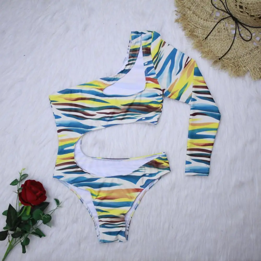 2020 в полоску на одно плечо с принтом Для женщин Плавание одежда длинными рукавами - купить