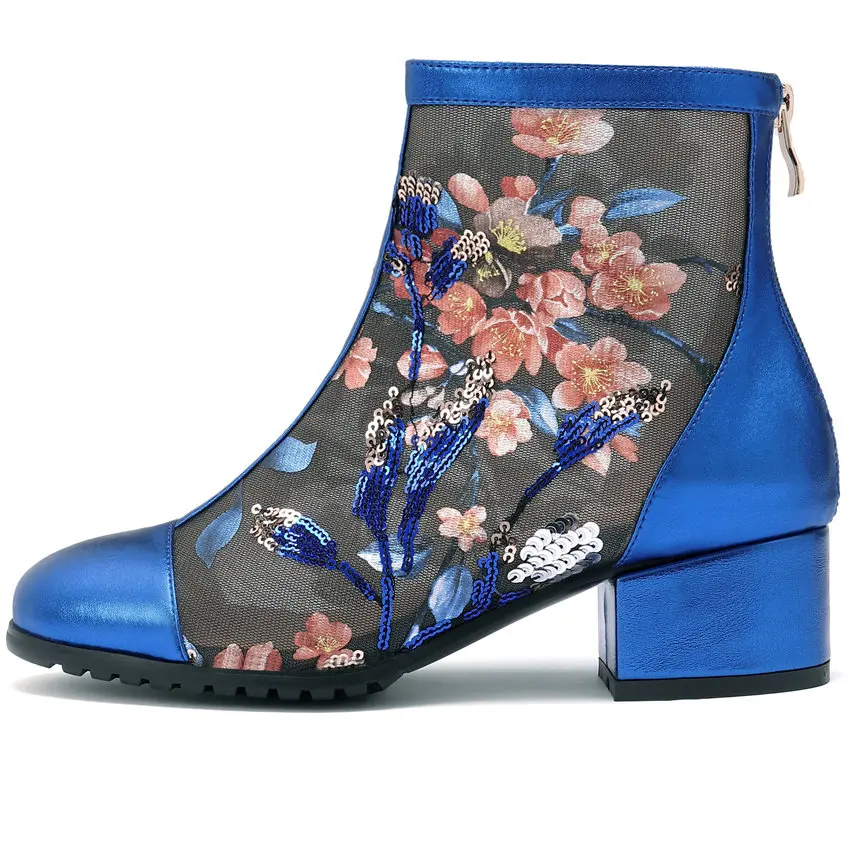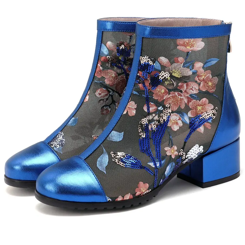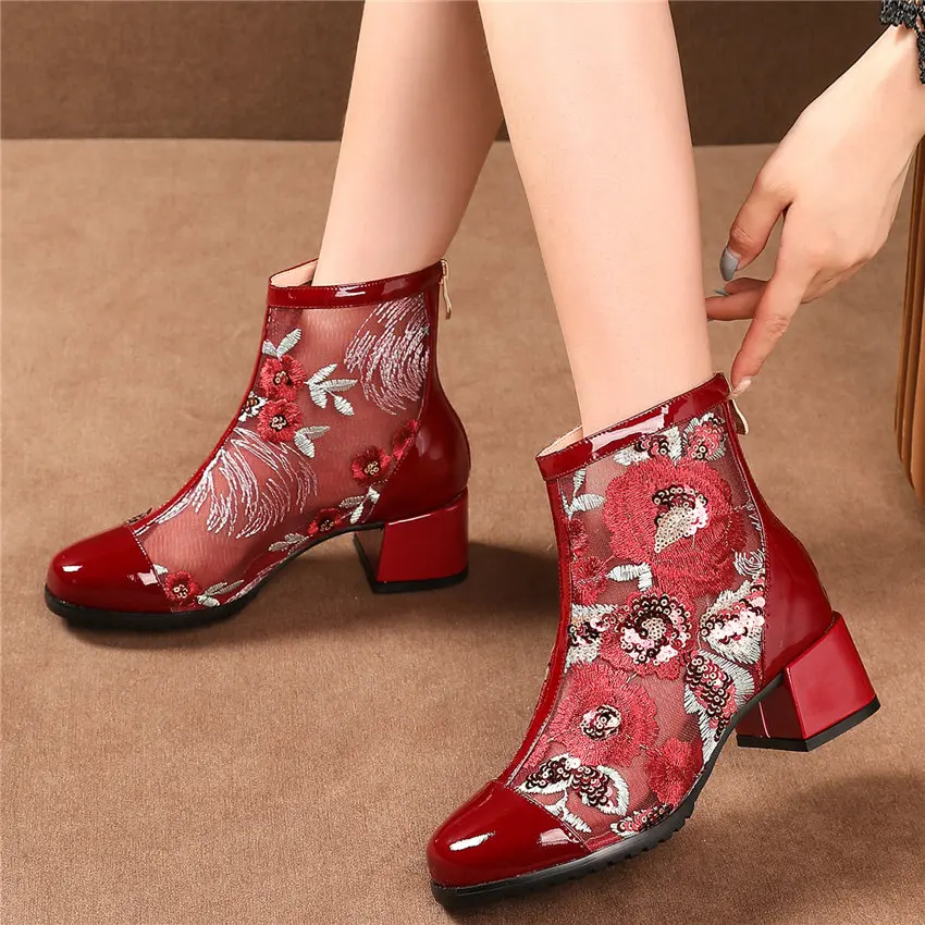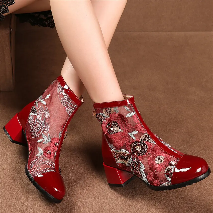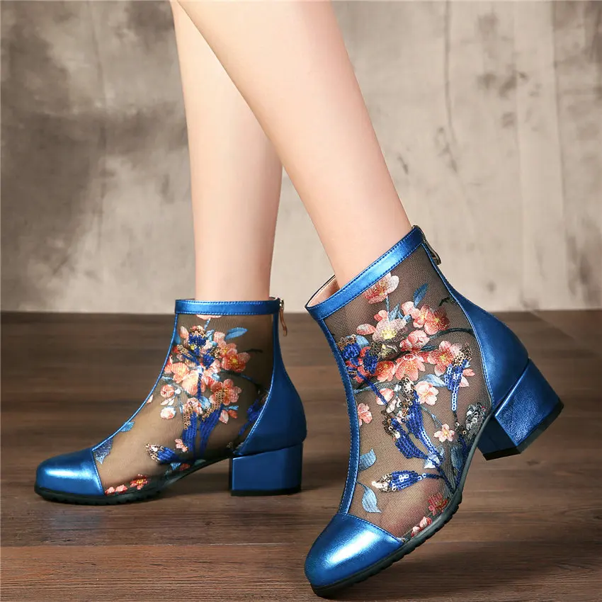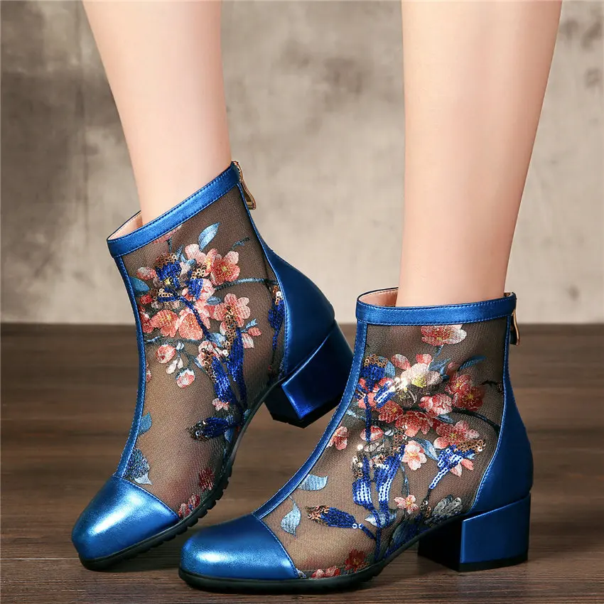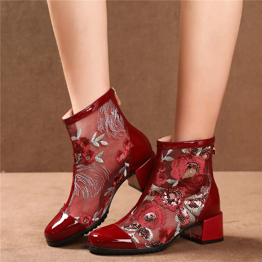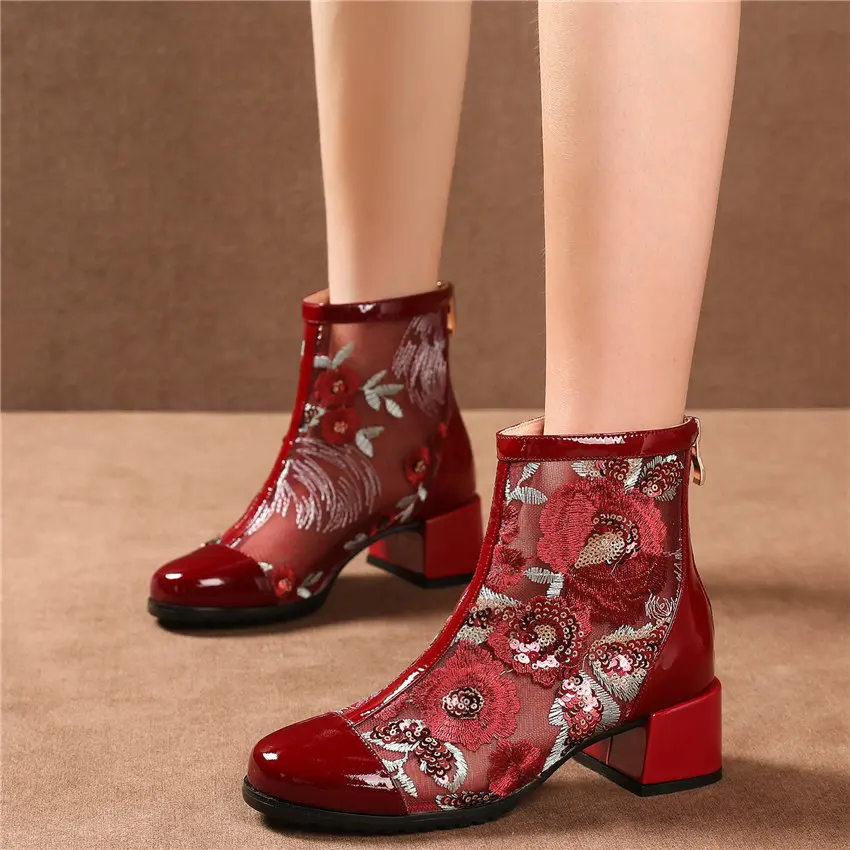 Women Genuine Leather Med Heels Wedding Party Pumps Breathable Lace Embroider Flowers Ankle Boots Shiny Glitter Mary Jane shoes Обувь - купить