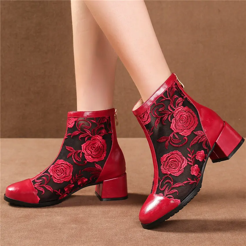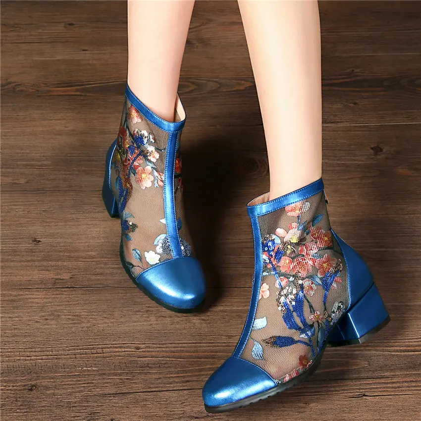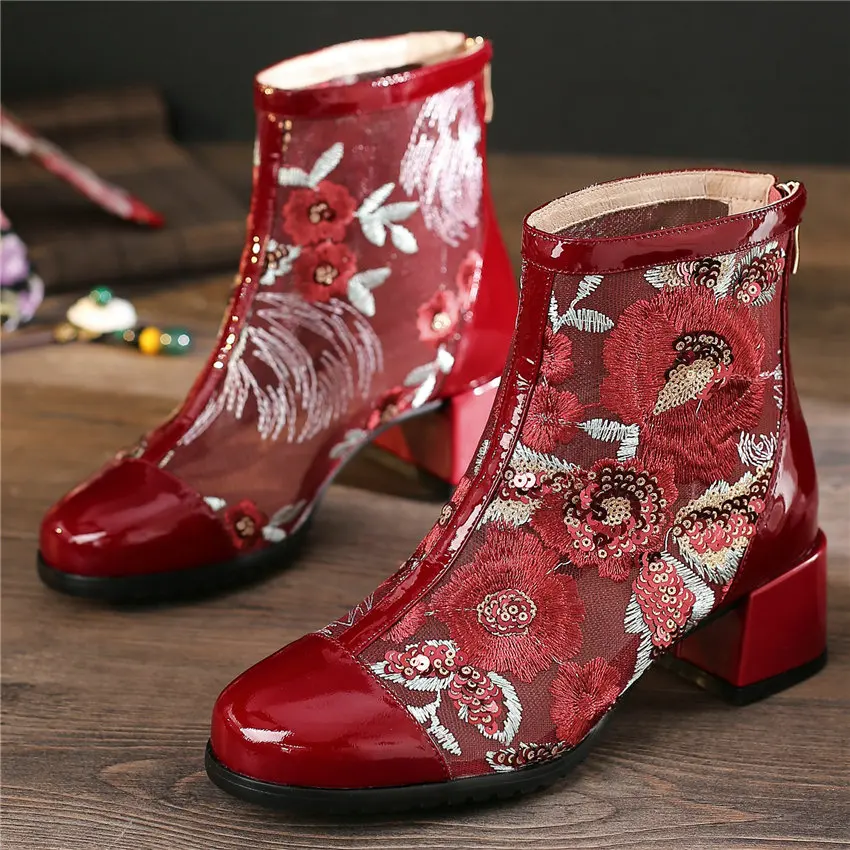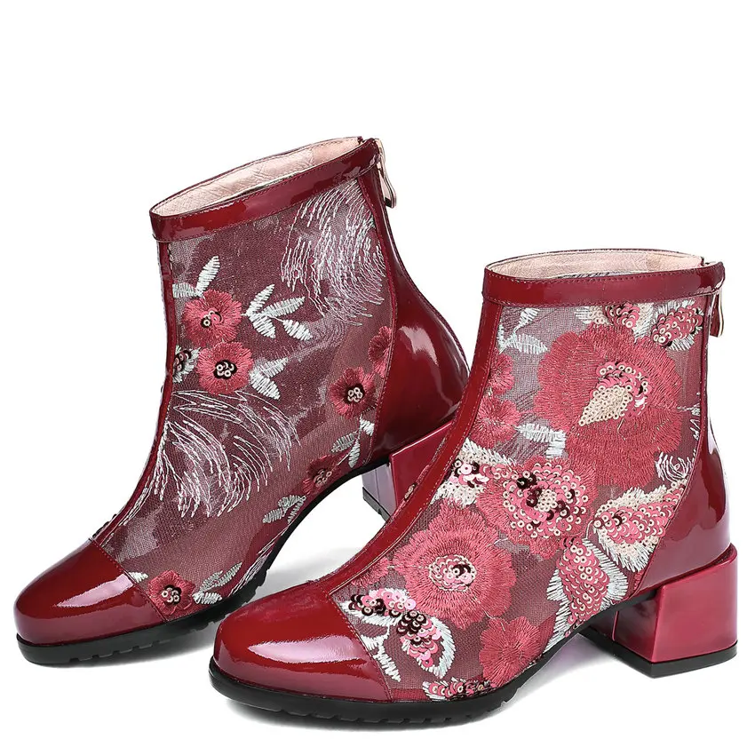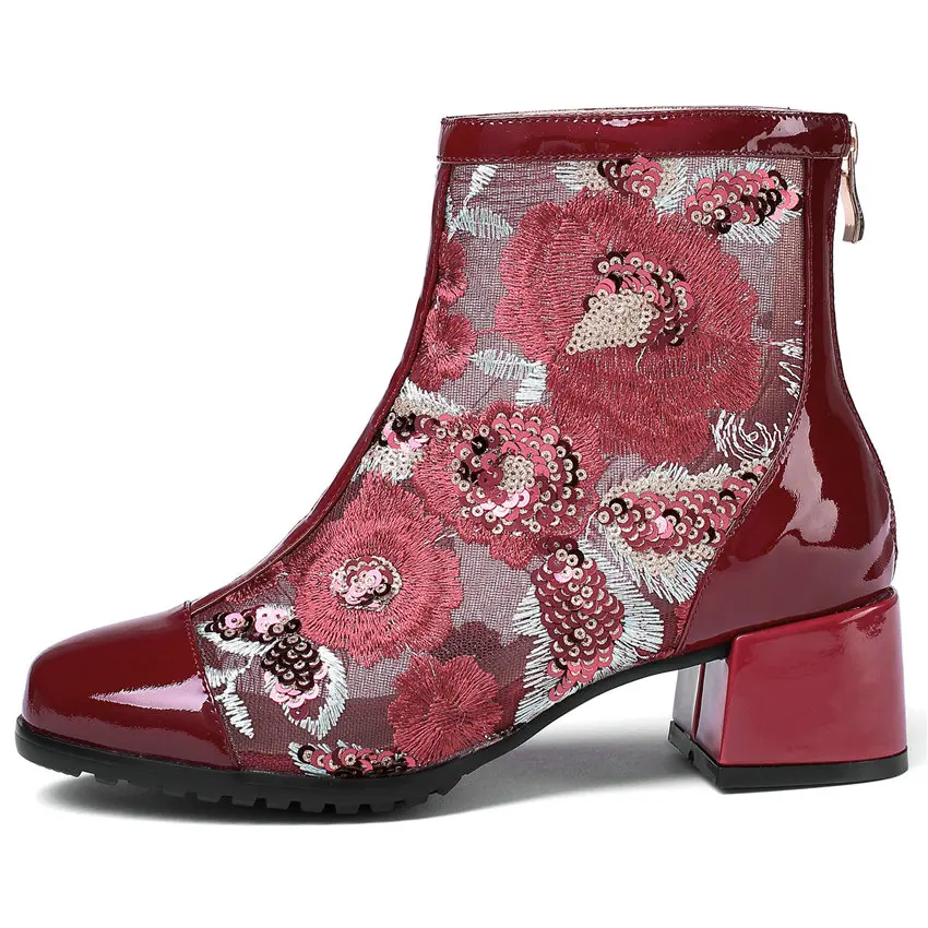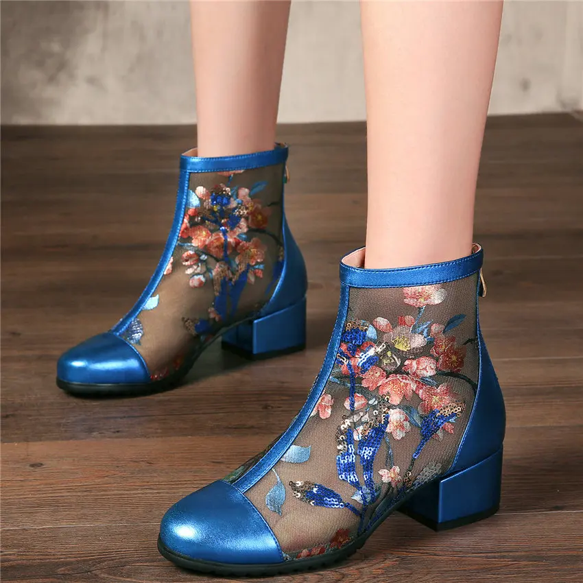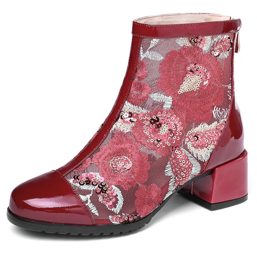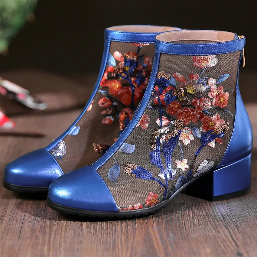 Women Genuine Leather Med Heels Wedding Party Pumps Breathable Lace Embroider Flowers Ankle Boots Shiny Glitter Mary Jane shoes Обувь - купить