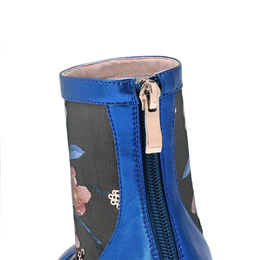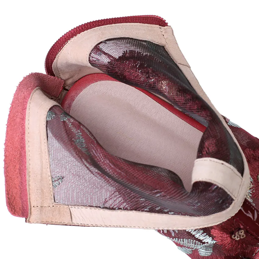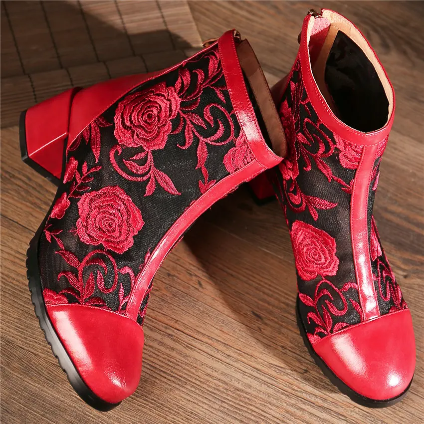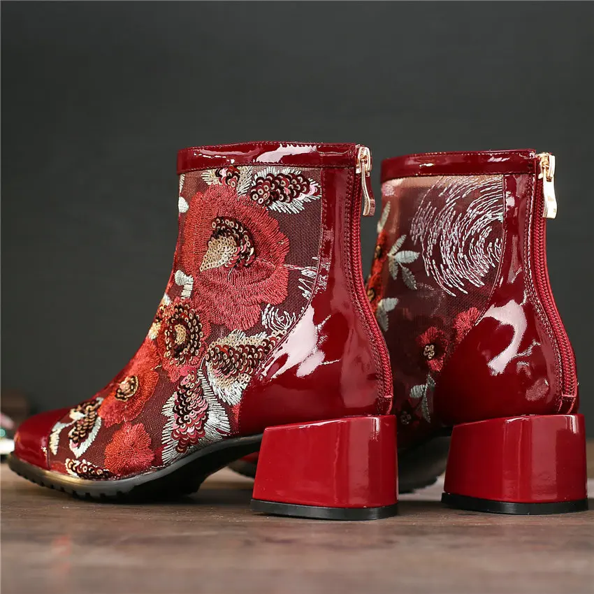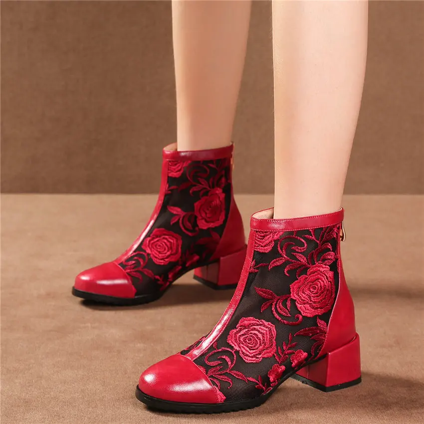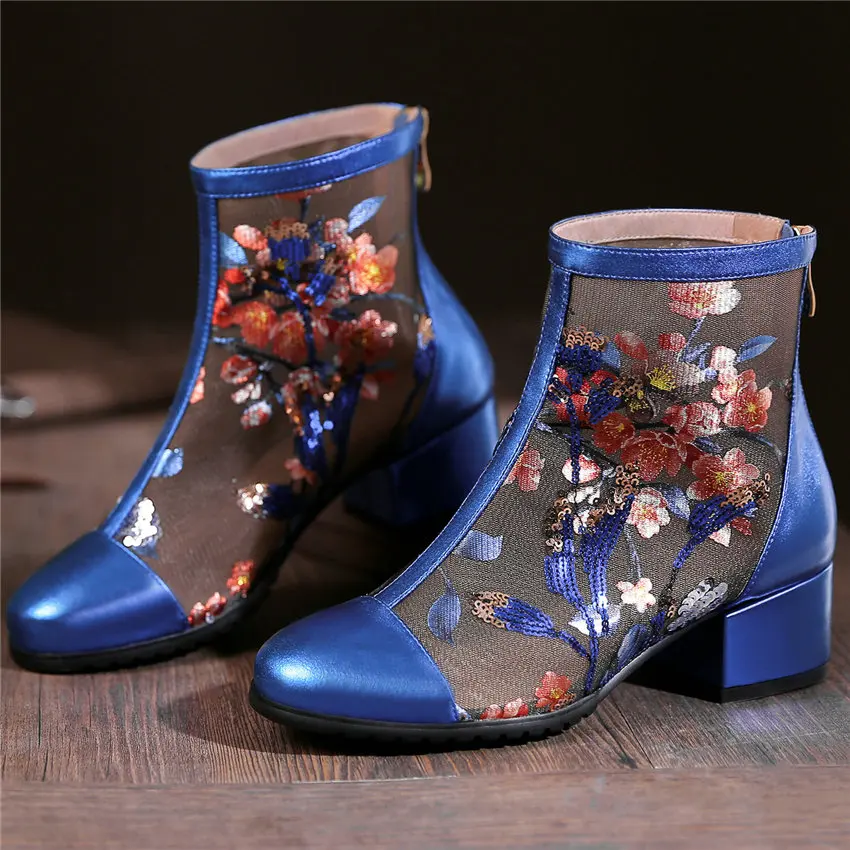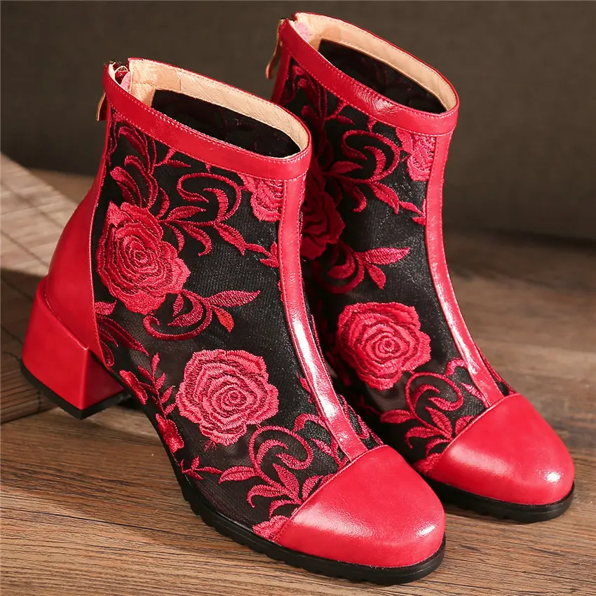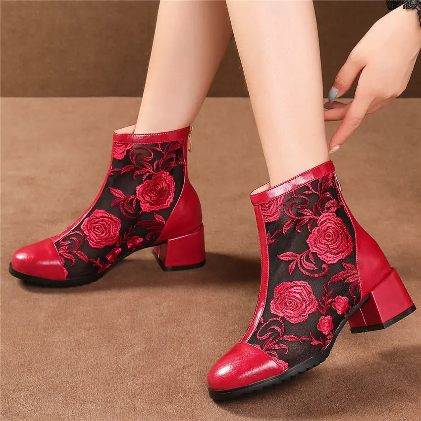 Women Genuine Leather Med Heels Wedding Party Pumps Breathable Lace Embroider Flowers Ankle Boots Shiny Glitter Mary Jane shoes Обувь - купить