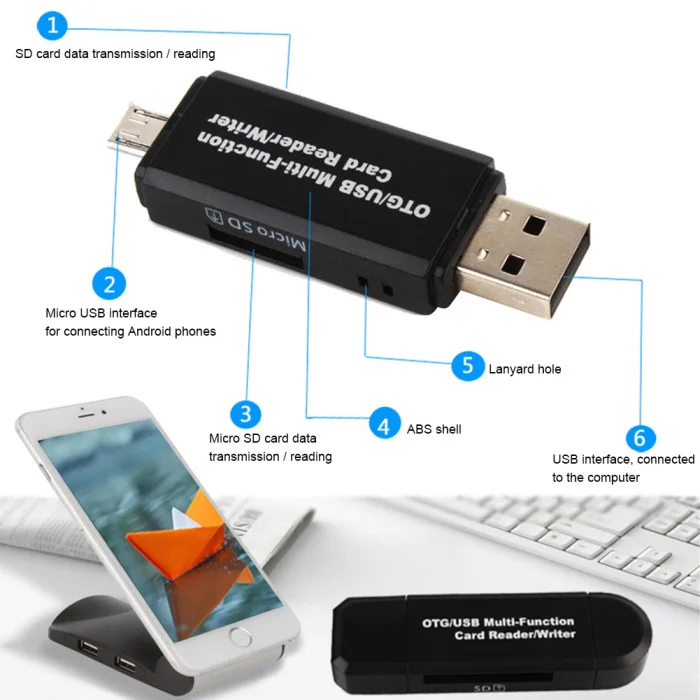 USB 2,0 SD/microSD кард-ридер для передачи данных, совместим с электронными устройствами, такими как ПК, ноутбук, смартфон и планшет