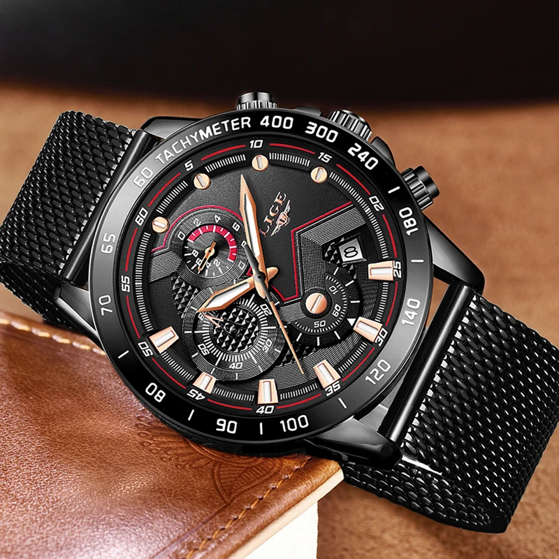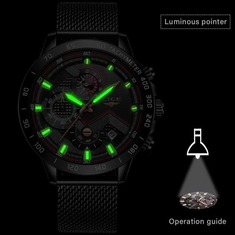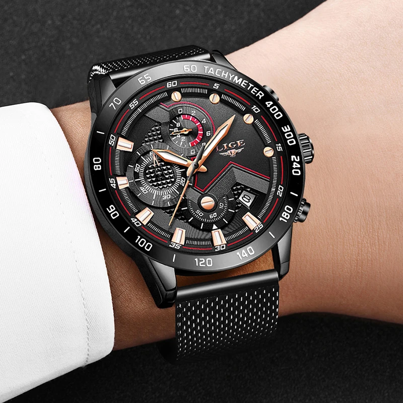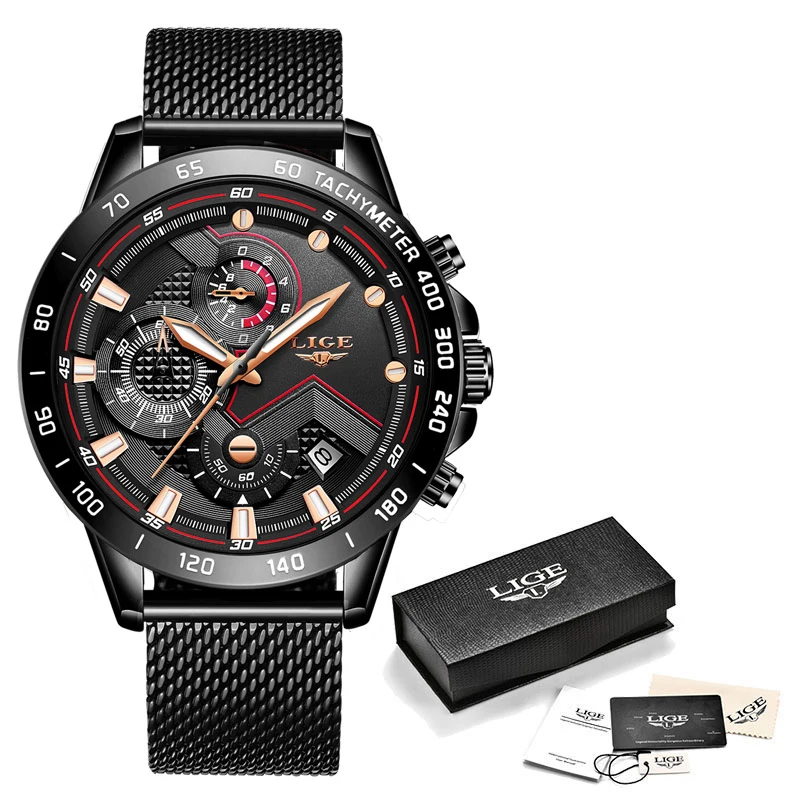LIGE новые часы.Сетчатый ремень из нержавеющей стали и черный чехол. Это стильные и повседневные часы. С хронографом, автоматическим календарем, водонепроницаемым, ударопрочным, светящимся и другими функциями; подходит для всех