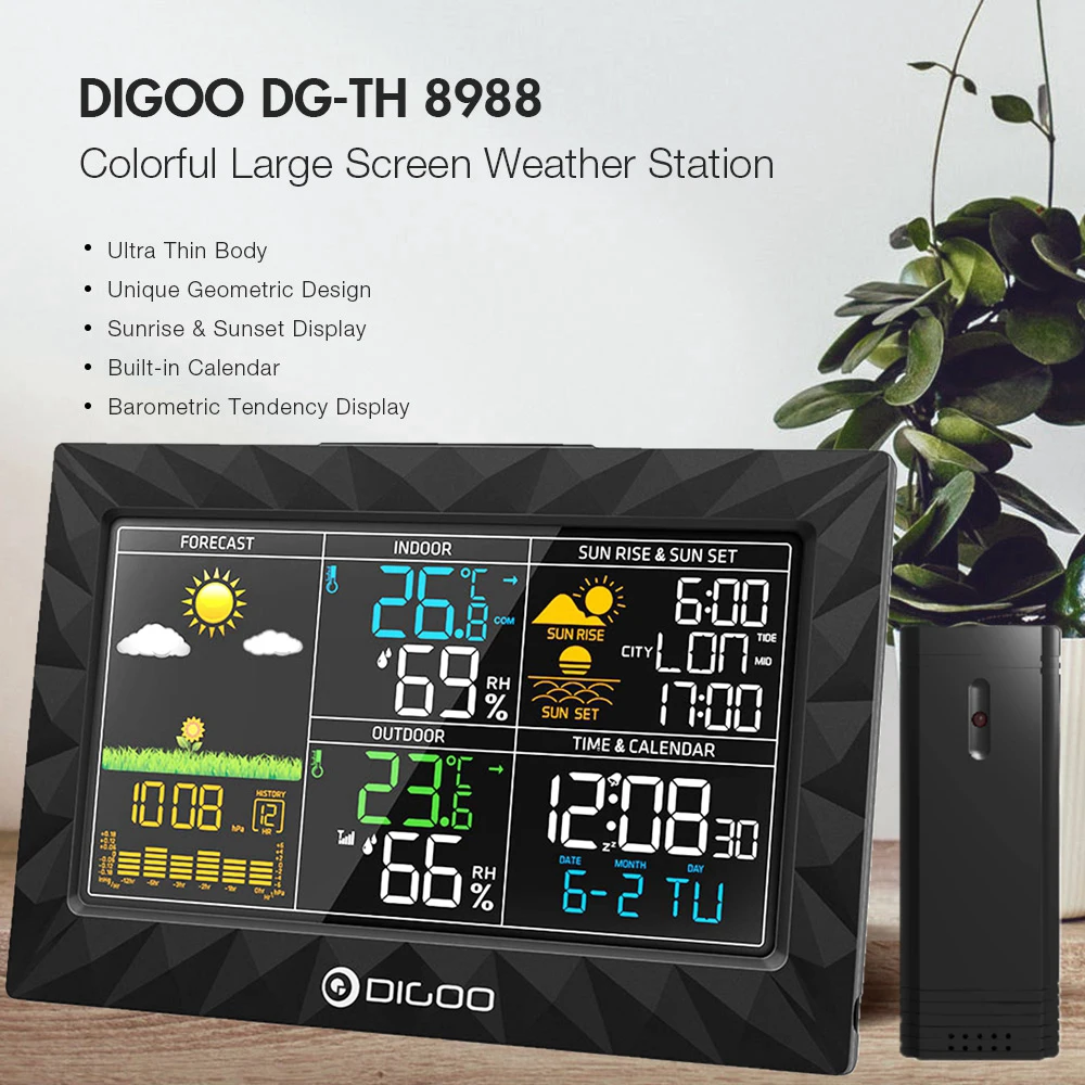{Infomdescirption} DIGOO DG-TH8988 цветной большой экран Метеостанция ультра тонкий корпус геометрический дизайн Sunrise Sunset дисплей открытый Крытый термометр гигрометр Температура Влажность Дистанционный датчик