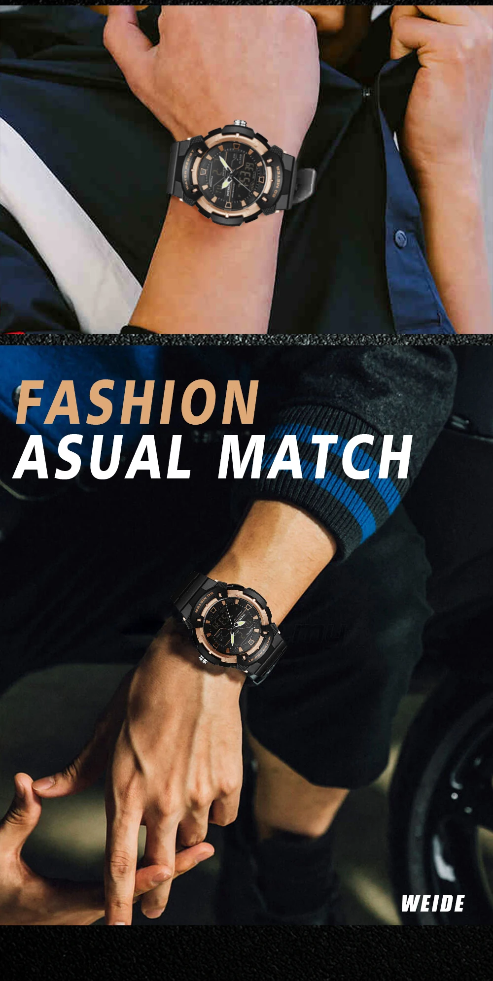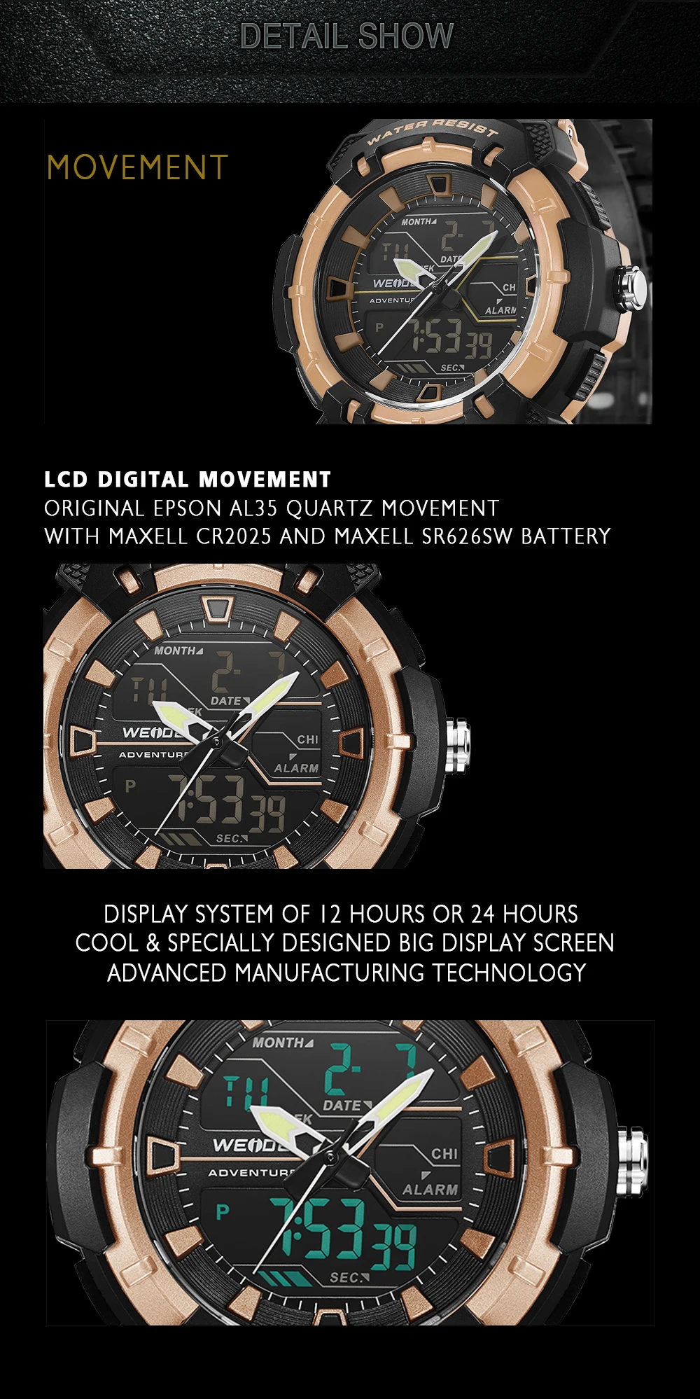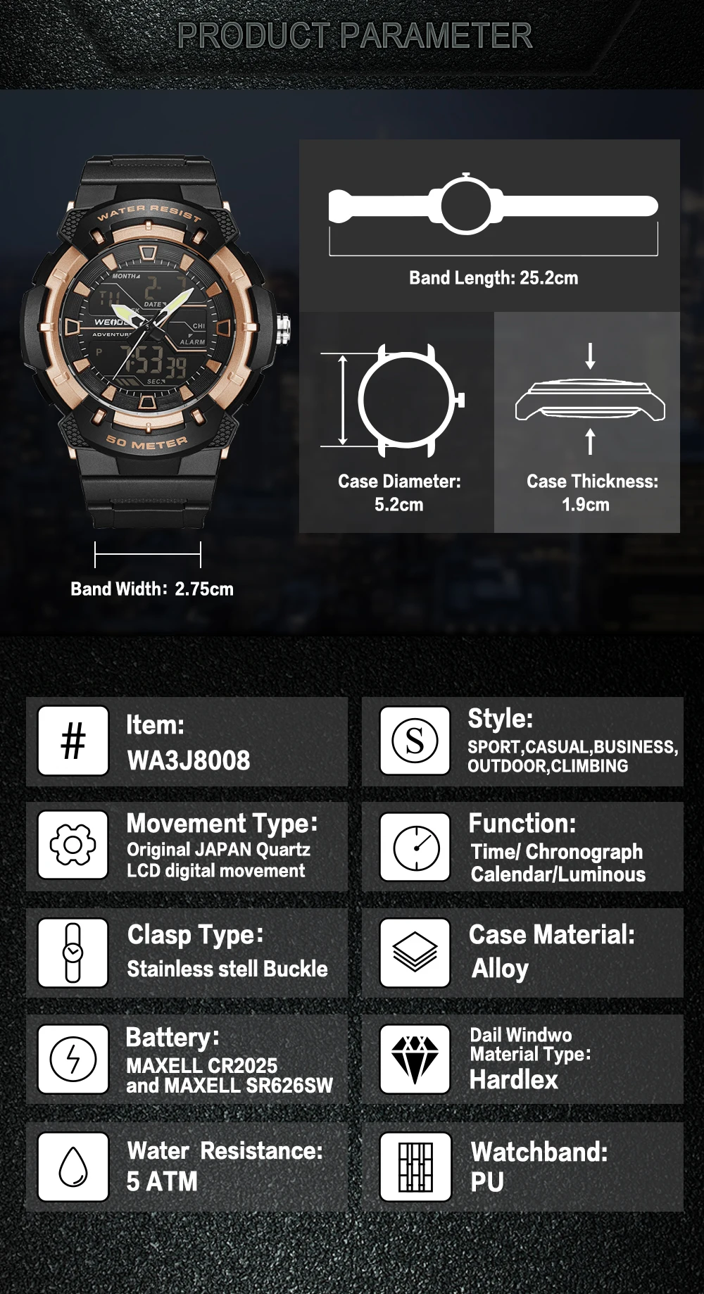 Описание продукта: Артикул: WA3J8008 Стиль: спортивный, Повседневный, Деловой, уличный, для скалолазания Дисплей: ANALOG-LCD цифровой Механизм: цифровой ЖК-дисплей, японский кварцевый механизм Особенности: -Восемь привлекательных вариантов; -Передовая технология производства; -Оригинальный кварцевый механизм EPSON AL35 с батареей maxell-cr2025 и maxell-sr626sw; -Классный и специально разработанный большой дисплей; -Заводная головка с экологичным бронзовым гальваническим покрытием IPS; -Пряжка и задняя крышка из нержавеющей стали с 3D логотипом WEIDE; -Система отображения 12 часов или 24 часов; -Время, секунды, месяц, дата, день, неделя, будильник, секундомер, функция подсветки; -Водонепроницаемость до 50 метров (пожалуйста, не нажимайте кнопки под водой); -Погрешность в ходьбе ± 45/м; Рабочая температура: от-10 °C до + 50 °C -Материал ремешка: ПУ