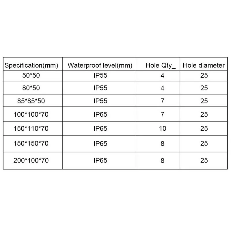 Размер: 50*50 мм, 80*50 мм, 85*85*50 мм, 100*100*70 мм, 150*110*70 мм, 150*150*70 мм, 200*100*70 мм,