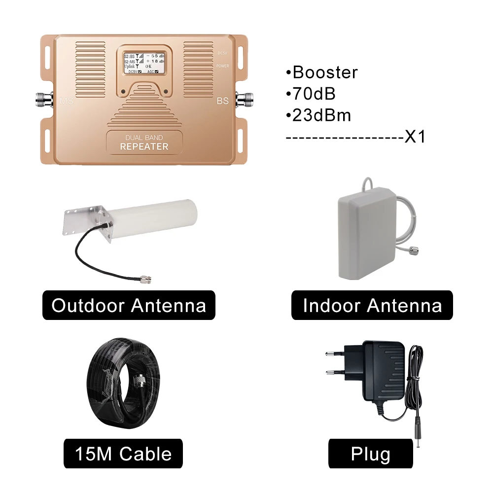1. 850 + 1700 dual band ретранслятор 2. Наружная всенаправленная антенна 3. Внутренний панельная антенна 4,15 м кабель 5. Разъем Электропитания
