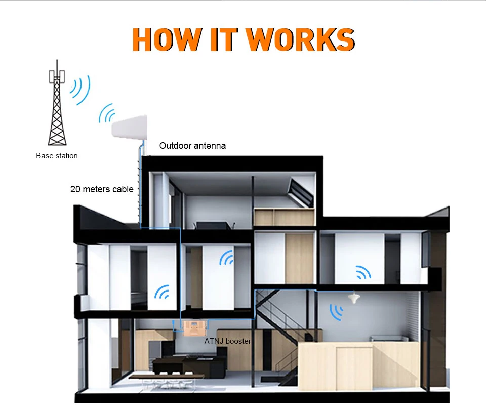 1. Поместите внешнюю антенну на верхней части здания, пусть ее в присутствии курьера базовой станции, И подключения внешней 20 м кабелем. 2. Подключите блок к 20 м кабель для того, чтобы «BS "порту на устройстве. 3. Закрепите комнатная антенна к потолку, подключите внутренняя 5 м кабель анимации. "MS" порт устройства и комнатная потолочная антенна. 4. Подтвердите все детали в подключение готово, кнопка включения устройства, завершения установки.