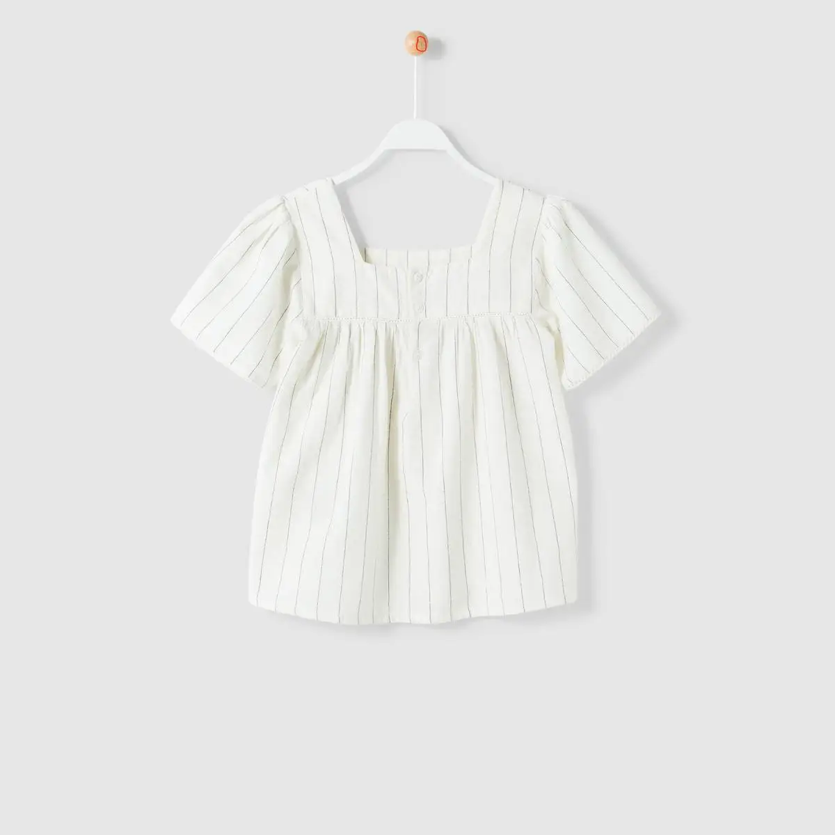 Белая блузка с короткими рукавами и принтом в полоску. Есть квадратное ожерелье