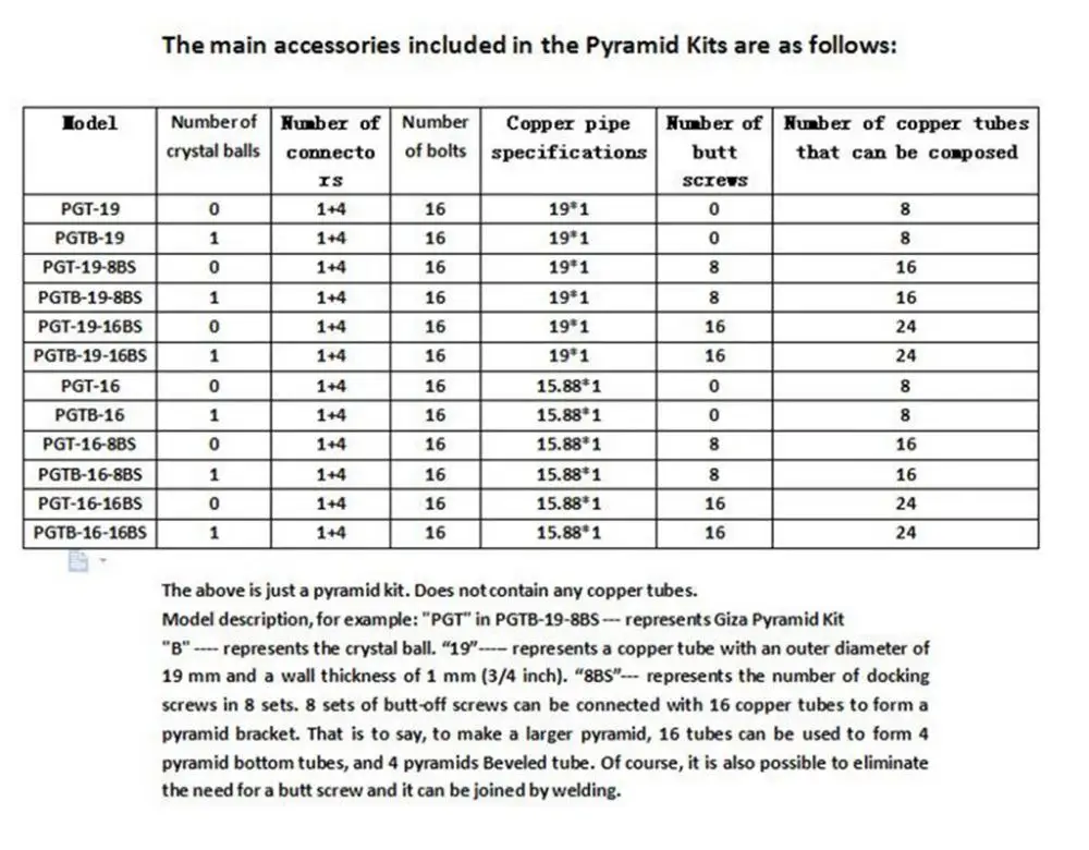 Например, если вы хотите собрать пирамиду Giza (Медитация Пирамида открытой рамки)С нижней частью башни 1455.3mmX1455.3mm и высотой башни 36 дюймов, Выберите первый ряд данных (первая группа), нужно только перейти в магазин аксессуаров, чтобы купить 4 медные трубкиДиаметром 16 мм,Каждый имеет толщину стенки 1 мм,Длина 1342,3 мм и 4 медных трубки диаметром 19 мм,Каждый имеет толщину стенки 1 мм,Длина 1262,6 мм,Затем подключите комплект Giza Pyramid, вы можете легко владеть им.