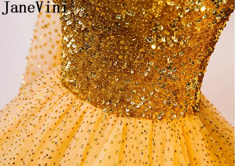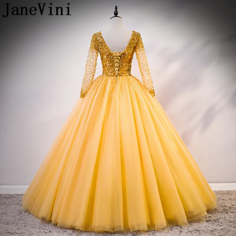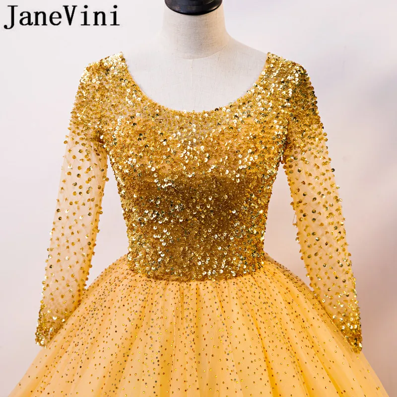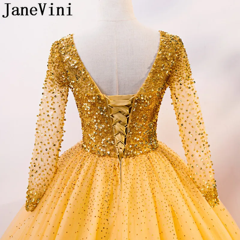 JaneVini/роскошное платье с длинными рукавами и золотыми бусинами; Пышное Платье с блестками и фатиновой юбкой; 16 платьев; Платья; vestidos de debutantes