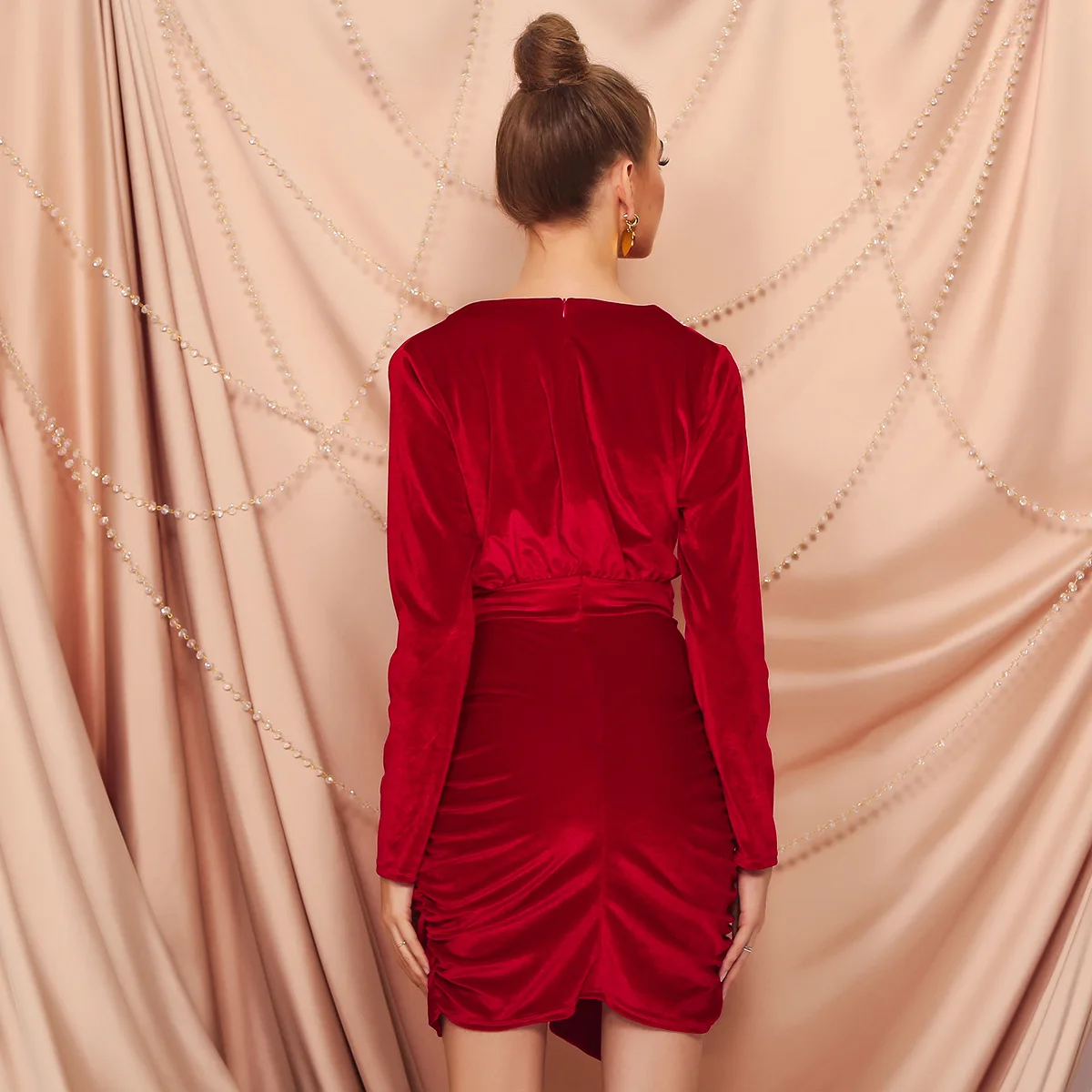 Купить DFLlifes Velvet Solid V-Neck Sexy Club Women Dresses Long Sleeve Slim Draped Red Sparkle Dress Black Mini Vestidos 2020 Hot | Женская