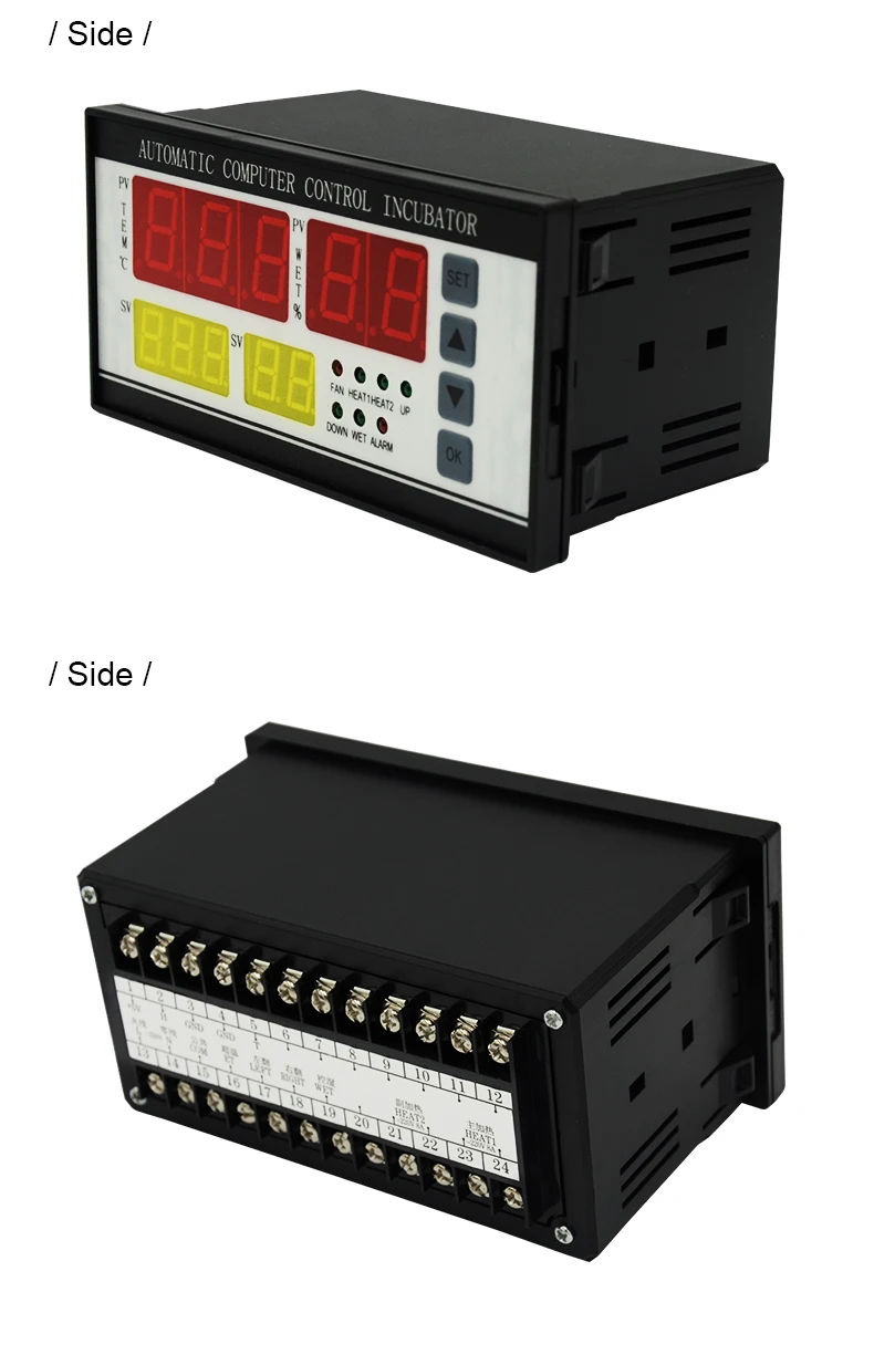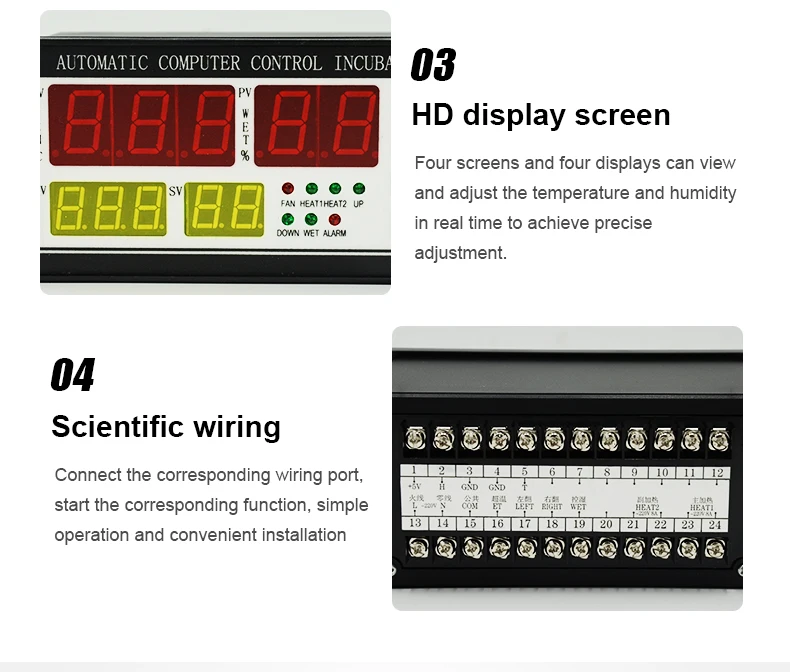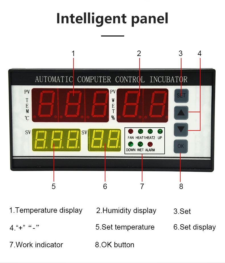 1. Цифровое Отображение температуры, влажности2. Полностью автоматический контроль температуры3. Полный автоматический контроль влажности4. Полное автоматическое переворачивание яиц5. Полный автоматический сигнал тревоги6. Полный автоматический вентилятор7. Задняя аварийная системаОсновной технический индекс:1. Диапазон отображения температуры: 0 ~ 99,9 ℃2. Точность измерения температуры: ± 0,1 ℃3. Диапазон отображения влажности: 0-99% отн. Влажности4. Точность контроля влажности: ± 3% RH5. Количество сигнал-выход: 7 дорога (перегрев, контроль температуры, недостаточная температура, поворот яйцо-влево, поворот яйца вправо, контроль влажности, будильник)6. Максимальный выходной ток нагрузки: контроль температуры, недостаточная температура <= 8A/AC 220V, перегрев, поворот яйцо-влево, поворот яйца вправо, контроль влажности, сигнал тревоги <= 1A /AC 220V7. Количество переворачивания яйца: Максимальная запись 999 раз.8. Цикл переворачивания яиц: от 0 до 999 минут (заводская установка на 90 минут)9. Время поворота яиц: от 0 до 999 секунд (заводская настройка на 180 секунд)10. Цикл вентиляции: 0-999 минут (заводская установка на 120 минут)11. Время вентиляции: 0-999 секунд (заводская установка на 30 секунд)12. Длина измерительной линии: около 2 метровУсловия работы:1. Источник питания: переменный ток 160 В ~ 240 В, 50 Гц (выберите тот, который вам нужен)2. Относительная влажность: менее 85%3. Температура окружающей среды: -10 ℃ ~ 60 ℃