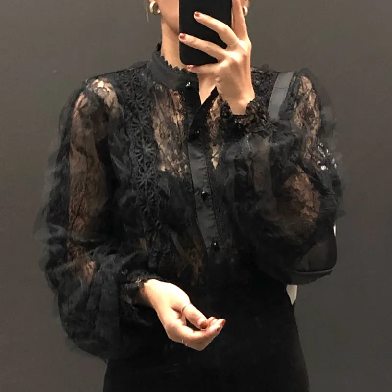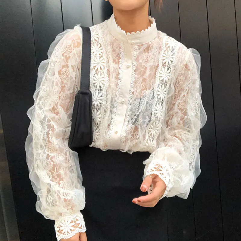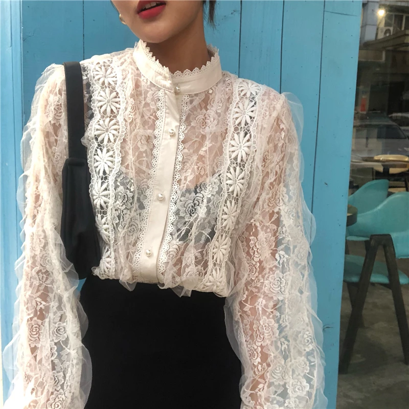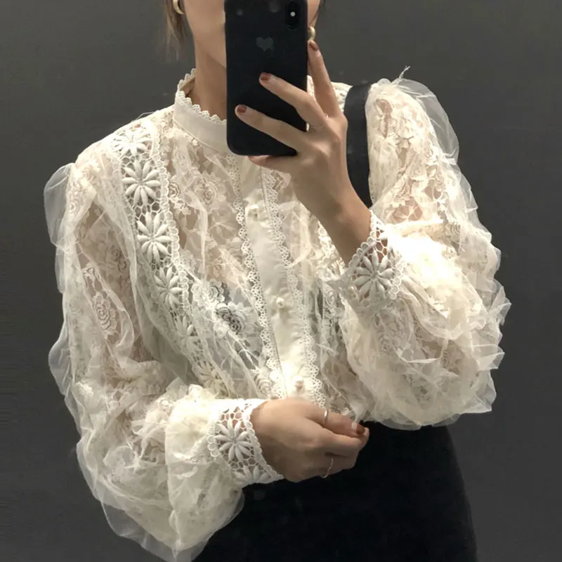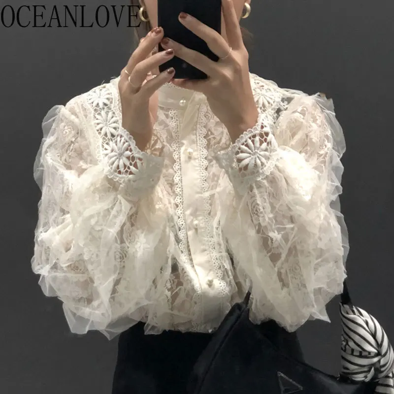 OCEANLOVE Korean Ins Vintage Women Blouses Stand Collar Lace 2020 Blusas Mujer Solid Hollow Out Romantic Shirts Spring 14566 Женская - купить