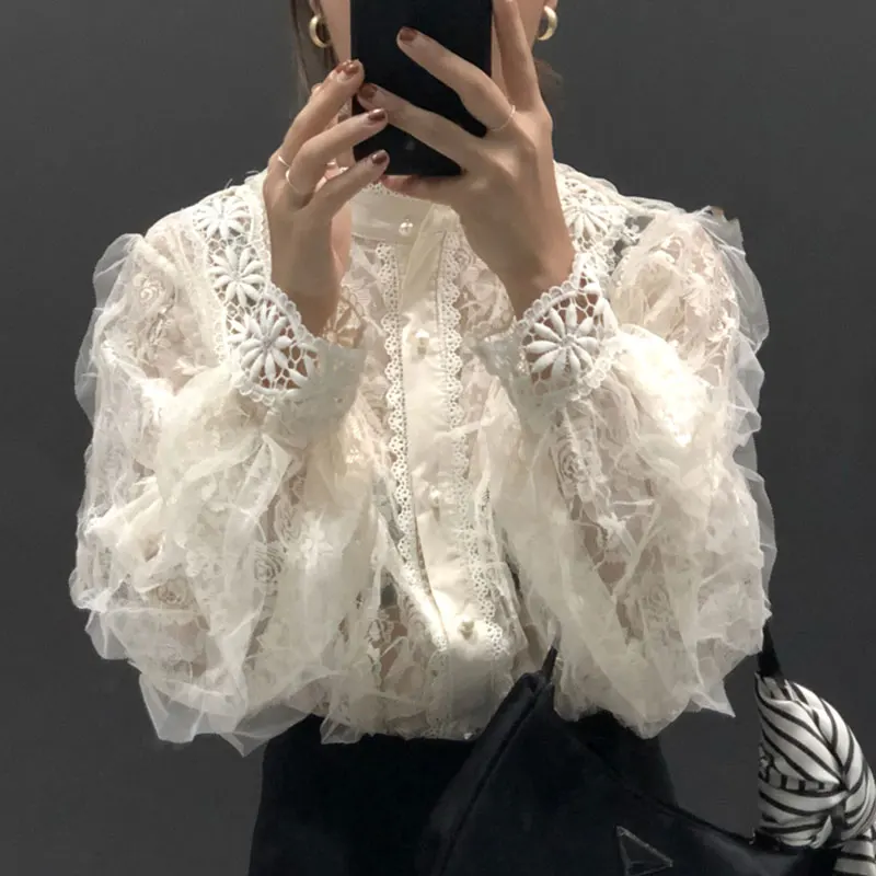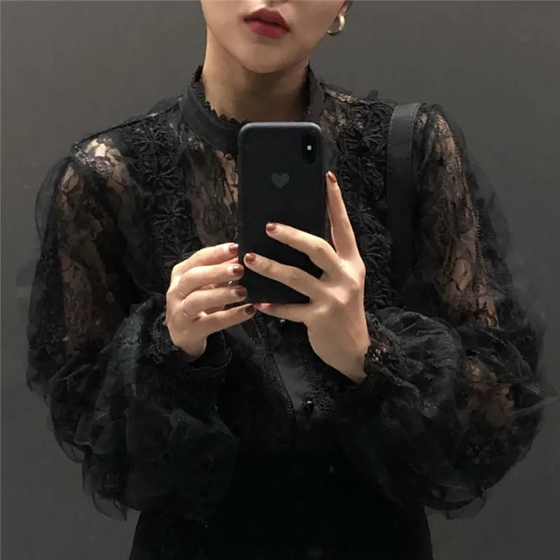 Отзывы о OCEANLOVE Korean Ins Vintage Women Blouses Stand Collar Lace 2020 Blusas Mujer Solid Hollow Out Romantic Shirts Spring 14566 Женская