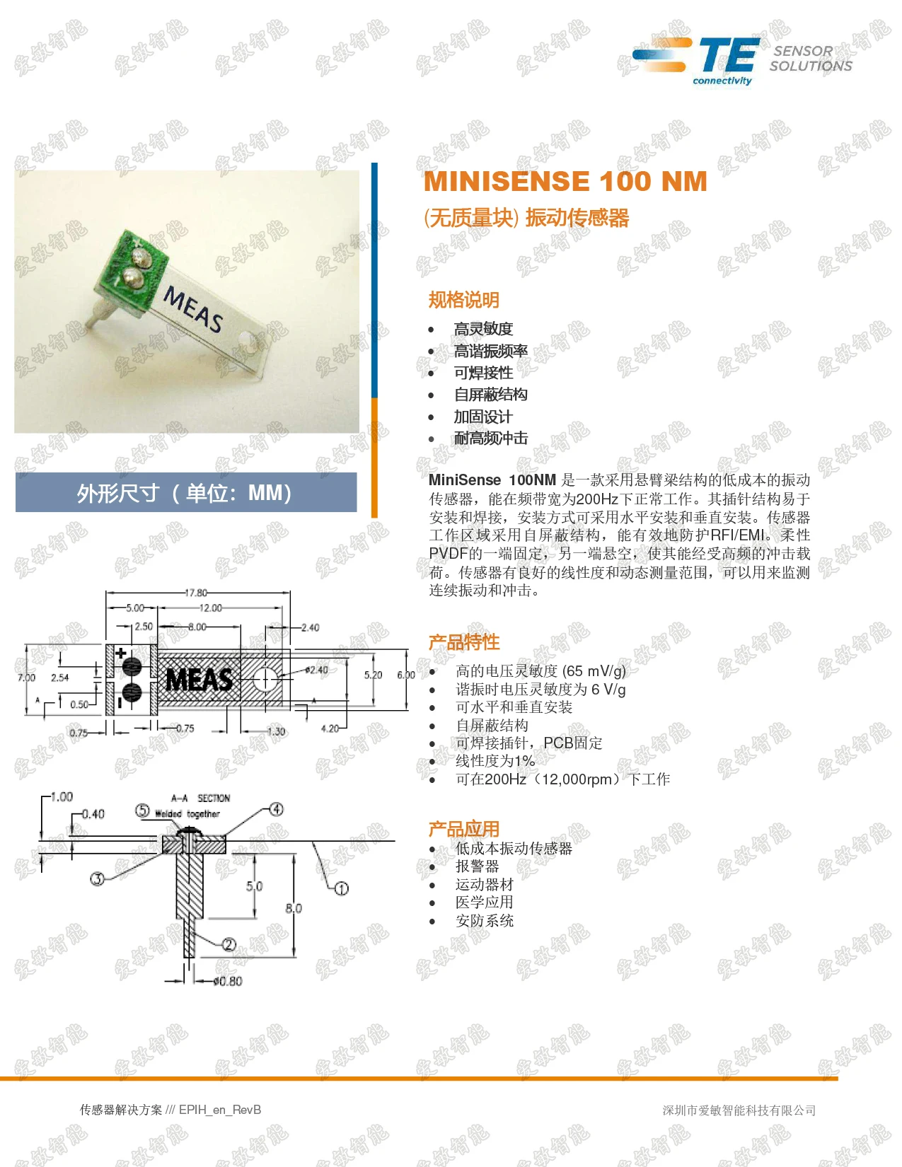 MiniSense 200 нм-это недорогой консольный датчик вибрации, способный работать на ширине диапазона частот Гц. Конструкция штифта проста в установке и сварке, а метод установки может применять горизонтальную и вертикальную установку. Рабочая зона датчика имеет функцию самозащиты, Который может эффективно защитить RFI/EMI. Один конец гибкого PVDF зафиксирован, а другой подвешен, что позволяет ему выдерживать высокочастотные ударные нагрузки. Датчик обладает хорошей линейностью и динамическим диапазоном измерения и может использоваться для контроля непрерывной вибрации и ударов.