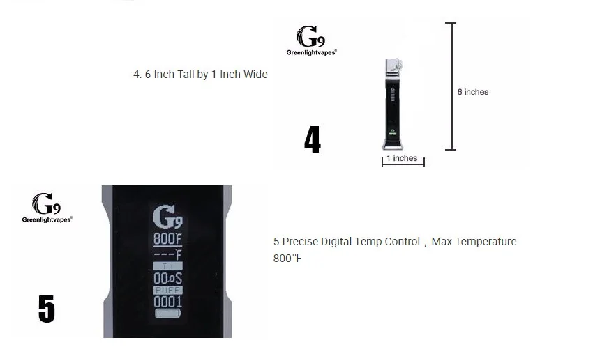 1. Емкость аккумулятора: 3000 мАч 2. Диапазон температур: 300-800 ℉ 3. Катушки: Силиконовая тарелка/керамическая тарелка/кварцевая тарелка/титановая тарелка 4. Сопротивление: 0,3-3,5 Ом 5. Время зарядки: около 3,5 ч 6. Цикл зарядки: около 300 раз 7. Дисплей: 0,9 дюйма OLED белая подсветка 8. Использование для: воска, концентрата, эфирного масла