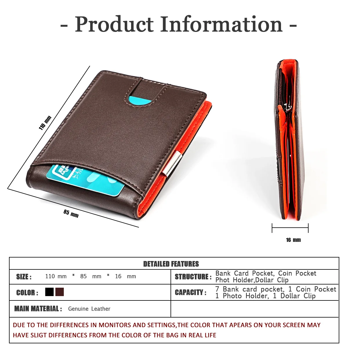 Материал: коровья кожа Размер: 11 см * 8,5 см * 1,6 см Вместимость: 7 отделений для карт + 1 карман для монет + 1 держатель для фотографий + 1 зажим для долларов Вес: около 90 г Примечание: Из-за погрешности измерения возможна небольшая разница в 1-10 мм с указанным выше размером.