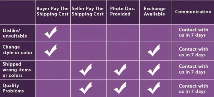 1. Если товары не совпадают с описанием или сломаны в пути. Когда вы покажете нам картинку. Мы повторно отправим или вернем деньги Деньги вам. 2. По любой причине, вы не удовлетворены товарами, мы принимаем возврат и обмен в течение 7 дней после получения Товар и вам нужно оплатить стоимость обратной доставки. 3. Если товар неисправен, пожалуйста, сообщите нам немедленно для замены или ремонта, если замена недоступна После этого возврат будет произведен с оригинальным методом оплаты