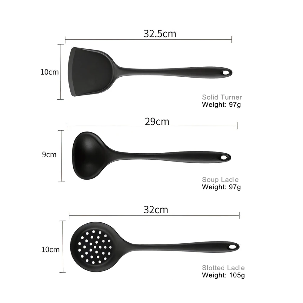Комплектация: 1 * Тонг 1 * щетка для протирания 1 * ковш с прорезями 1 * щелевой Тернер 1 * сервер пасты 1 * ложка для риса 1 * шпатель 1 * твердый Тернер 1 * ковш для супа 1 * держатель кухонных инструментов