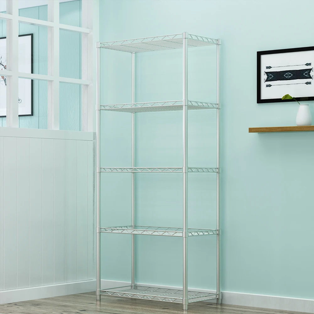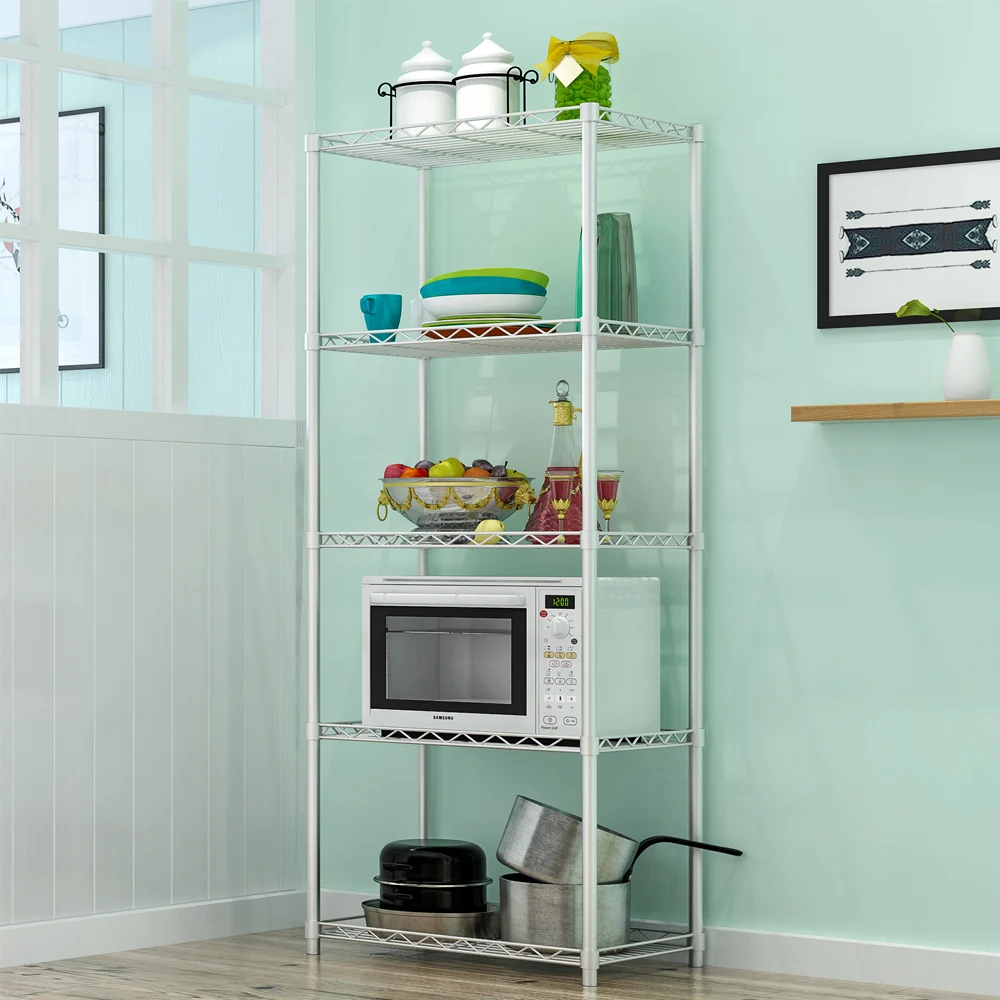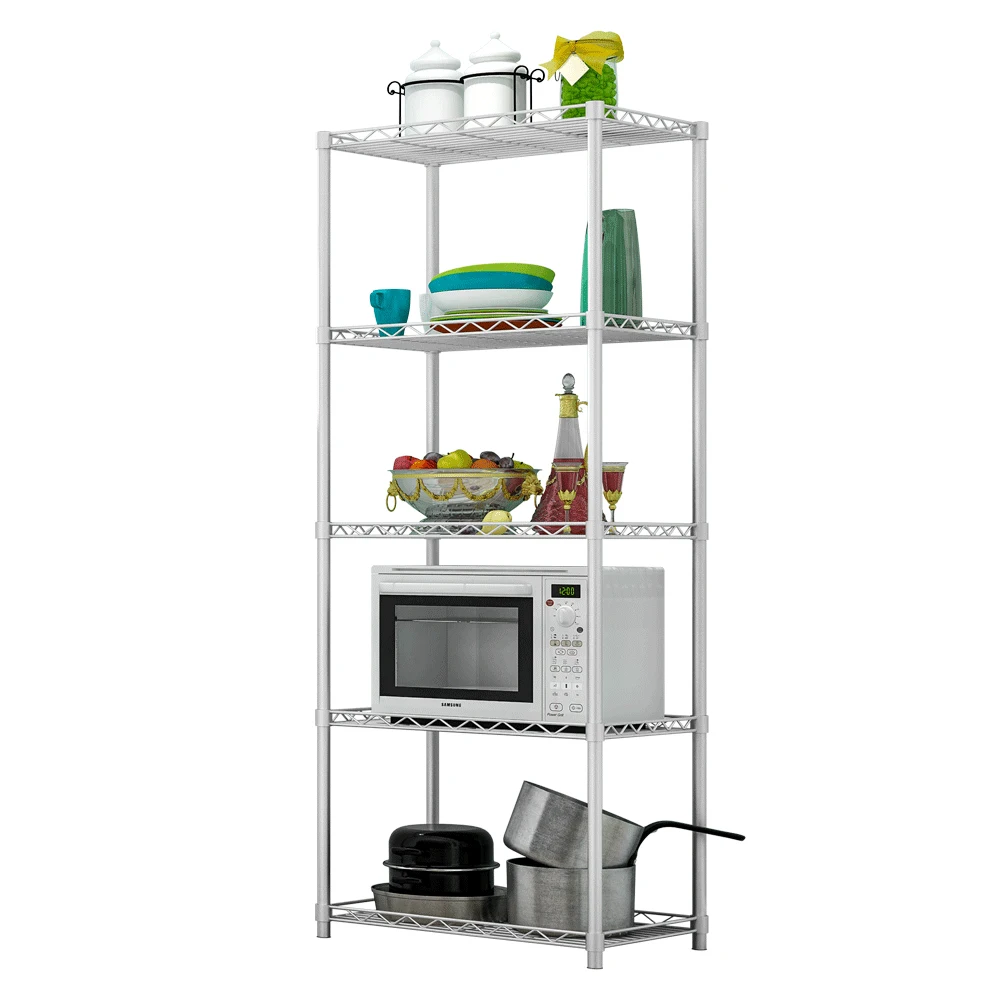 Большая емкость: 5-слойный для хранения кухонных вещей (микроволновая печь, банки, банки, кастрюли, блюда, бутылки и т. д.), продукты для ванной комнаты (шампунь, гель для душа, мыло, полотенце, фен и т. д.) и многое другое.