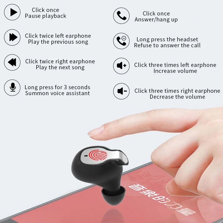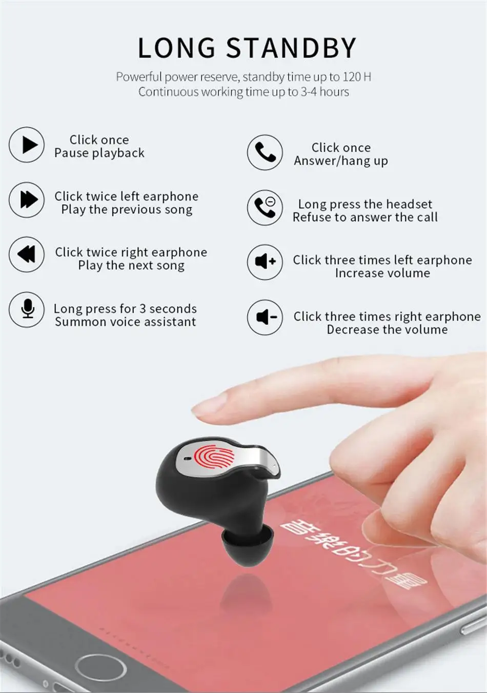Hi-Fi объемный звук, 5,0 в обоих ушах чип, большая емкость, беспроводная гарнитура Bluetooth. Графеновая басовая диафрагма, Hi-Fi высокочастотная технология, 10 мм динамический динамик. Два способа подключения: один/двойной свободный в использовании, одиночное ухо, прослушивание в одиночестве, прослушивание Hi-Fi стерео в обоих ушах. Binaural HD вызов, 5,0 Автоматическое Сопряжение загрузки, Встроенный активный шумоподавление IC. Функция: бинауральный hd-вызов, воспроизведение паузы, ответ на вызов, Отклонение вызова, воспроизведение конечного номера, вызов Siri, переключение песни вверх и вниз, Автоматическое Сопряжение, интеллектуальное шумоподавление, никаких задержек в игре.