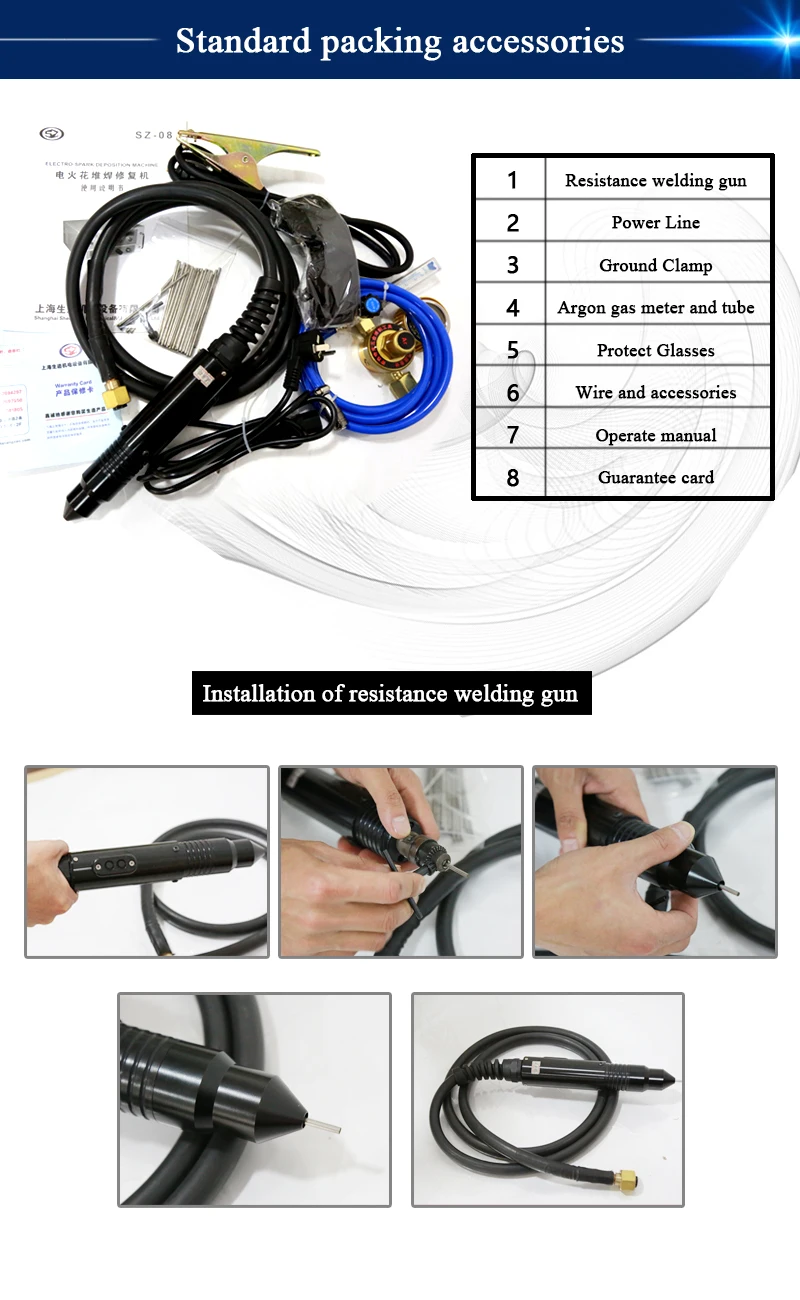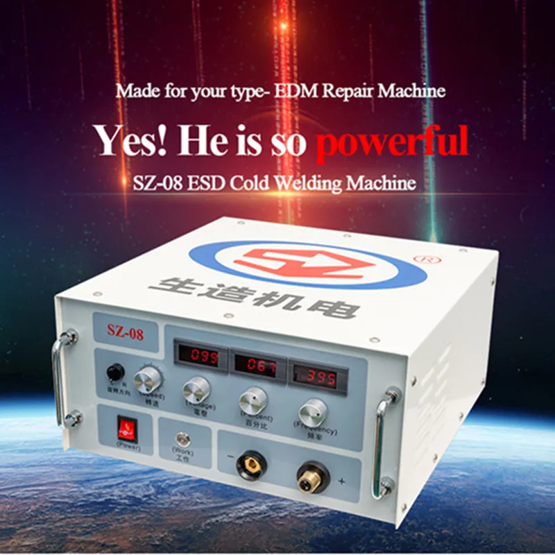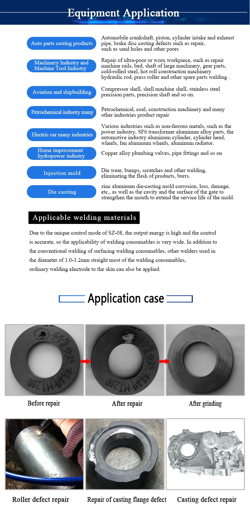 1. Принципы Технология опрокидывания электрической искры высвобождает энергию высокой мощности в пространство между металлическим электродом и базовым металлом мгновенно в высокой частоте. Благодаря газовой ионизации между электродным материалом и основным металлом образуются различные микродуговые каналы и образуются мгновенные высокотемпературные микроэлементы на поверхности родительского металла, материал электрода, подверженный микро-электрическому полю, должен быть сварен в основной металл и образует металлургическую связь. Технология Electro-spark-это повторяющийся и мгновенный процесс охлаждения при высоких температурах в микроклетках. Отличается от сварочной матрицы, никаких напряжений или деформаций, вызванных повышением температуры. 2. Характеристики (1) Передовые технологии: уникальная технология мягкого переключения/точное управление выходом (2) Энергоэффективность: с мощностью 1200 Вт Скорость и эффект SZ-8100 в несколько раз выше, чем у 2000 Вт. (3) высокая прочность сварки: из-за высокой мощности на одной точке SZ-8100, каждая точка сварочного материала должна сочетаться с матрицей в расплавленном состоянии для формирования металлургической связи, которая основана на огромных связывающих силах. (4) Высокоэффективная Сварка Cu, Al: сварочные работы для высокопроводимых металлов, таких как медь или алюминий, достижимы из-за мгновенного выхода высокой энергии. Более того, Он преодолевает хрупкие дефекты общего электроискрового осаждения. (5) Отсутствие отжига или деформации: Нет необходимости подогревать основание. Процедура наложения-это повторяющийся мгновенный процесс ввода-вывода тепла. Отсутствие деформации, подрезов или остаточного напряжения, вызванного перегревом. Пятно отжига ни. (6) Высокая точность ремонта: толщина наложительного слоя от нескольких микронов до миллиметров. Небольшое отклонение цвета или отсутствие хроматической аберрации можно увидеть после шлифовки и полировки. (7) Многофункциональность: Доступно для нанесения покрытия и укрепления поверхности и т. Д. Сварочные работы для черных металлов (железный шар/серый железо/нержавеющая сталь и т. д.) и цветных металлов (медь/алюминий и т. д.) (8) охрана окружающей среды: безвредный процесс. (9) удобство использования: доступно для всех. Накладки допускаются в труднодоступные места. (10) эффективность: немедленное восстановление на месте для повышения производительности и экономии расходов.