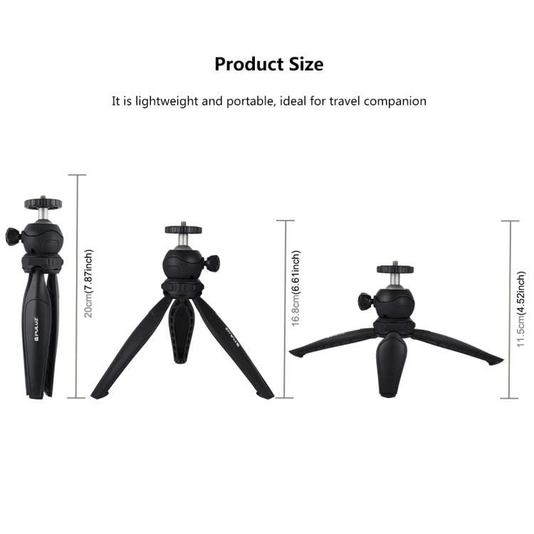 Brand NamePULUZModel NumberPU3537BTypeMini Tripod / LightweightMaterialPlasticUseAction CamerasUseDSLRsUseSMARTPHONESPackageYesMax Extened Length (mm)168Folded Length (mm)200Weight (g)155Measurement unit100000015Each pack1Unavailable in