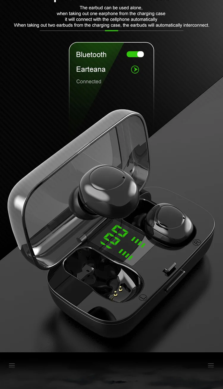 Имя Bluetooth: TWS-XG23 Версия Bluetooth: Bluetooth 5,0 Емкость аккумулятора: наушники: 50 мАч; Ящик для хранения: 400 мАч Время разговора: 3 часа Время работы: 3 часа Дальность передачи: 10 метров Время зарядки: 30-45 минут для наушников, 3-4 часа для хранения